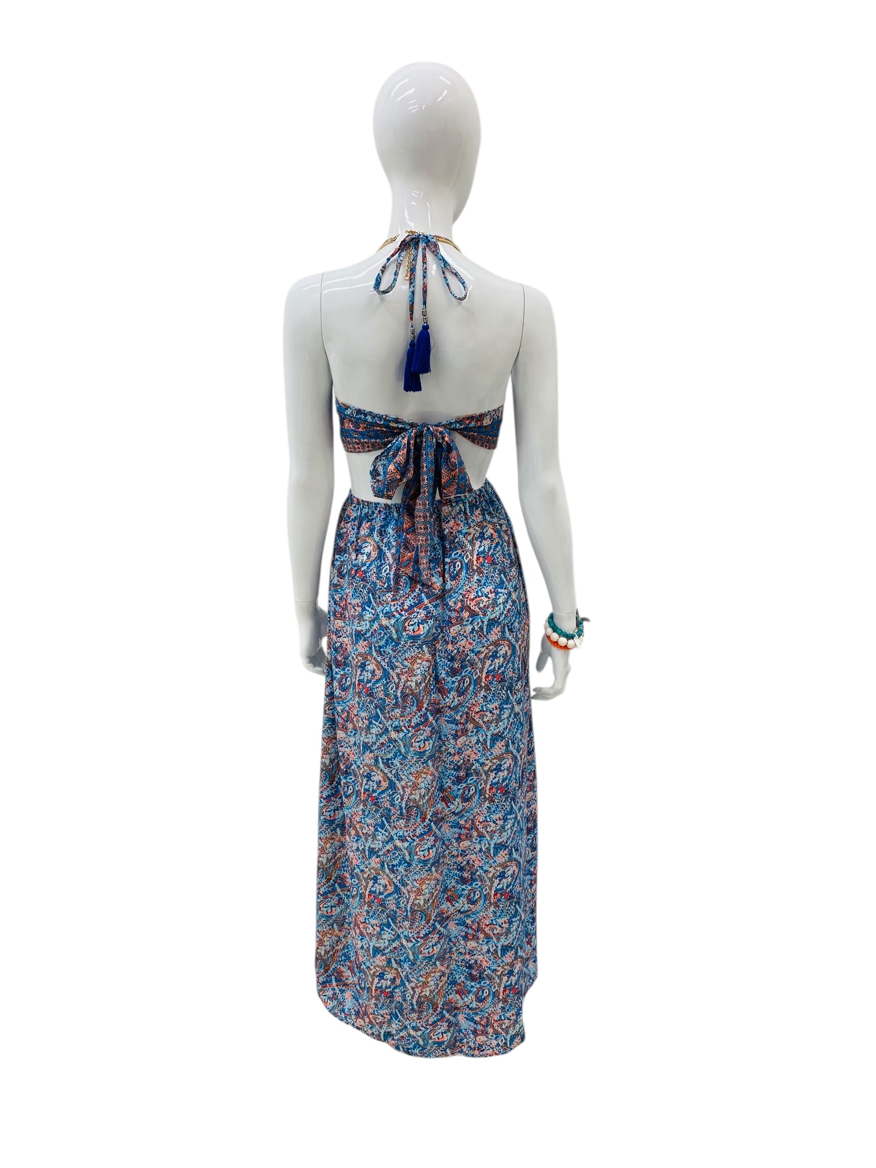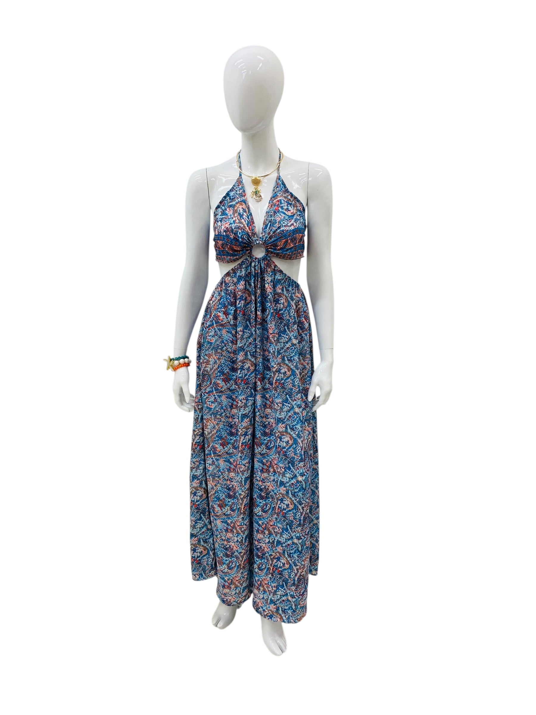 This blue halter maxi dress captures an effortlessly breezy, coastal vibe with its intricate floral-inspired print and lightweight flow. The deep neckline and center ring detail create a feminine, flattering shape, while the open-back design keeps it cool and airy for warm, sunny days.