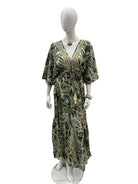 This is a flowy blue and cream kaftan-style maxi dress featuring a deep V-neckline, relaxed sleeves, and an adjustable drawstring waist for a flattering silhouette. The soft, artistic print gives it a free-spirited elegance, ideal for brunches, tropical vacations, garden parties, or relaxed resort evenings. Style it with woven sandals and statement jewelry for a refined boho look.