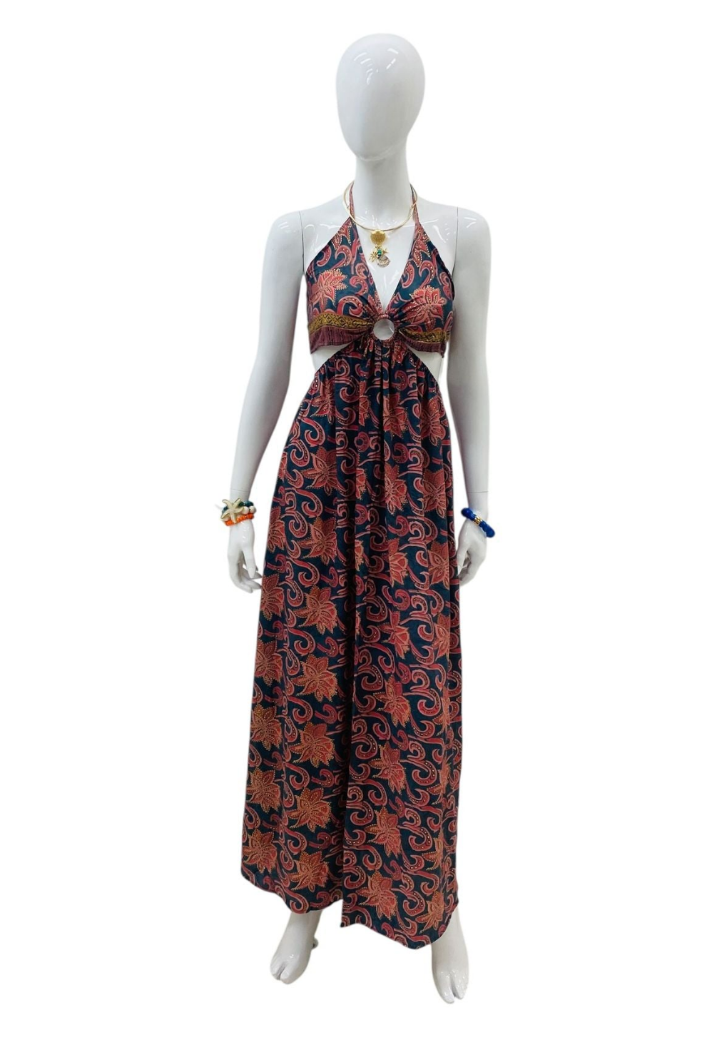 This halter maxi dress features a warm coral and navy pattern with a gathered empire waist and ring detail that flatters the silhouette beautifully. The color palette gives it a slightly more sophisticated and earthy feel while still staying true to a breezy, tropical vibe.