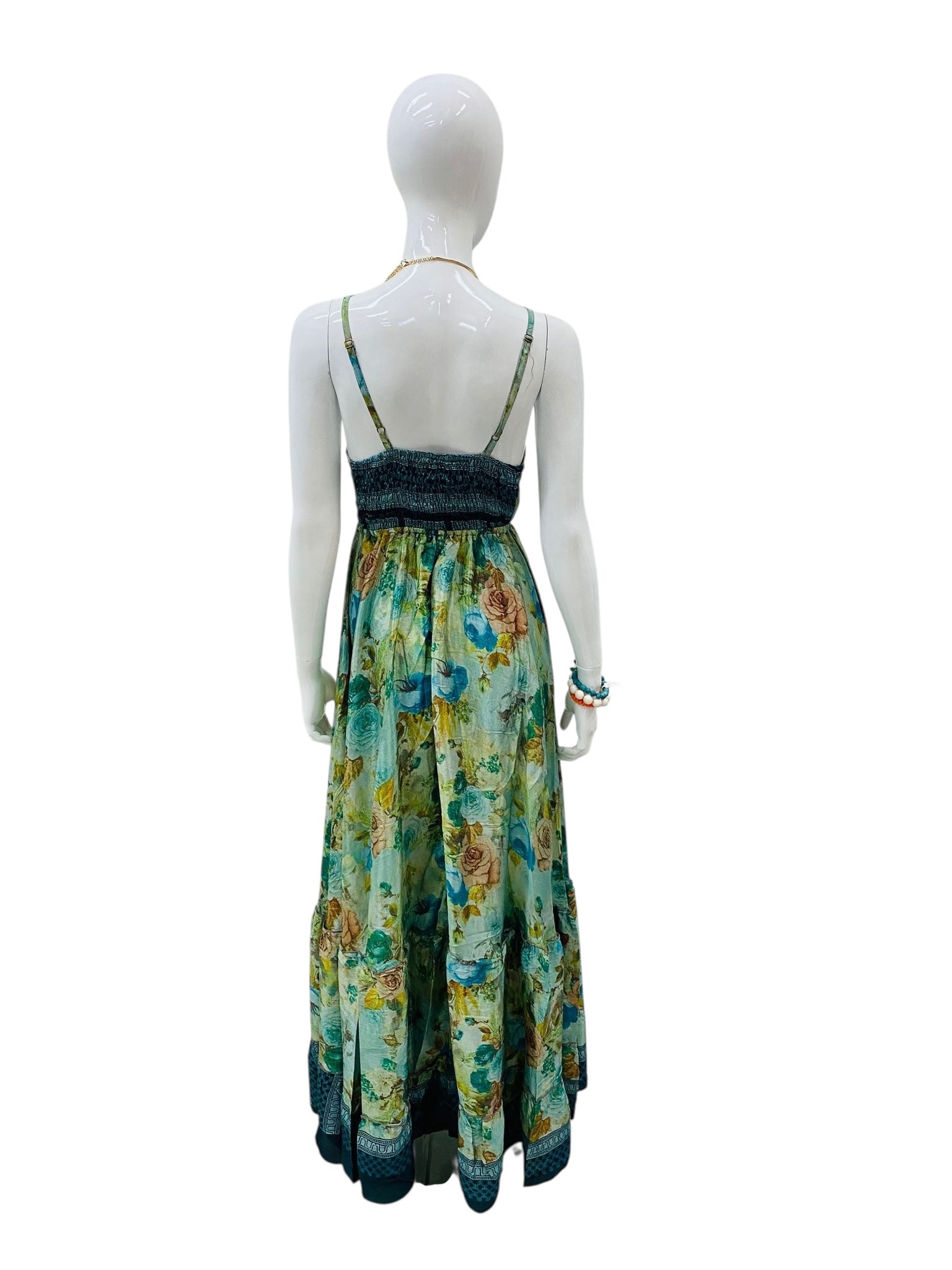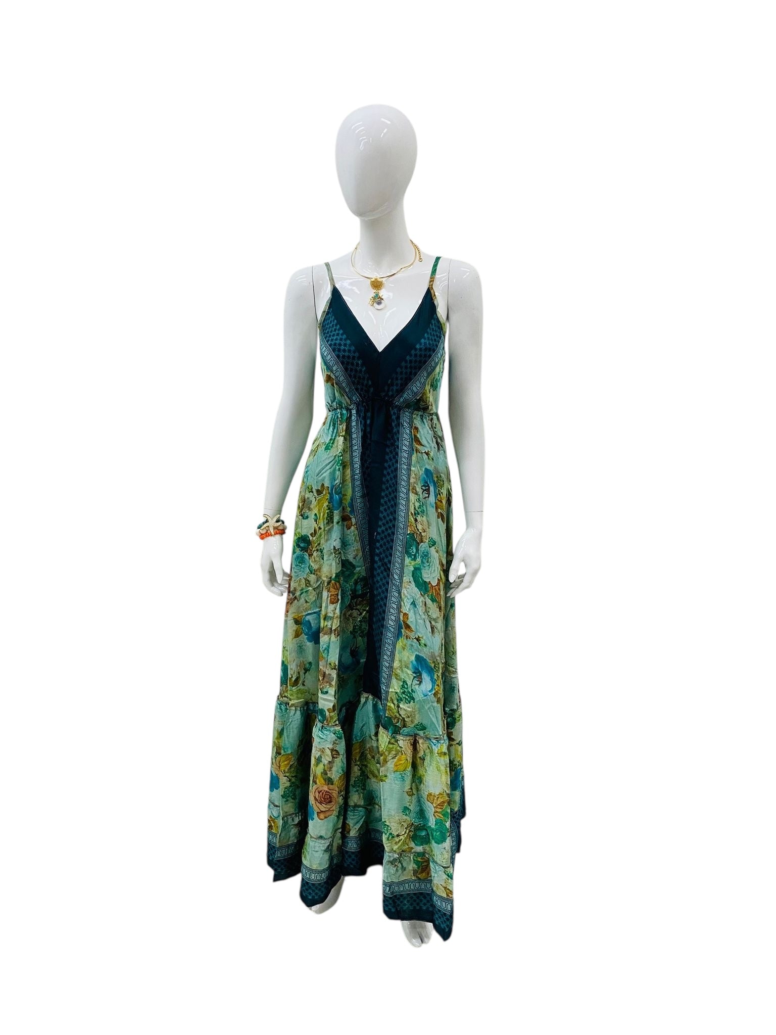 This dreamy maxi dress features a captivating mix of oceanic blues and tropical greens that instantly evoke the serenity of the sea. With its delicate spaghetti straps, deep V-neckline, and flowing tiered skirt, it offers a breezy elegance that moves beautifully with every step. The lightweight fabric and flattering empire waist make it perfect for warm, sunny days and relaxed evenings alike.