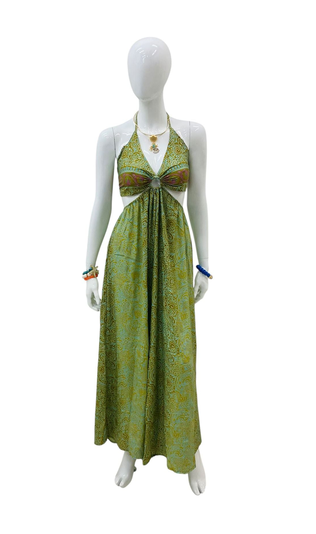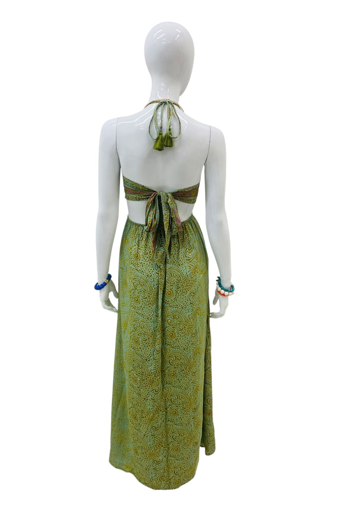 This green halter maxi dress has a breezy, bohemian charm with its soft paisley-inspired print and relaxed flow. The halter neckline and gathered bust add a flattering, feminine touch, while the open shoulders make it ideal for warm weather.