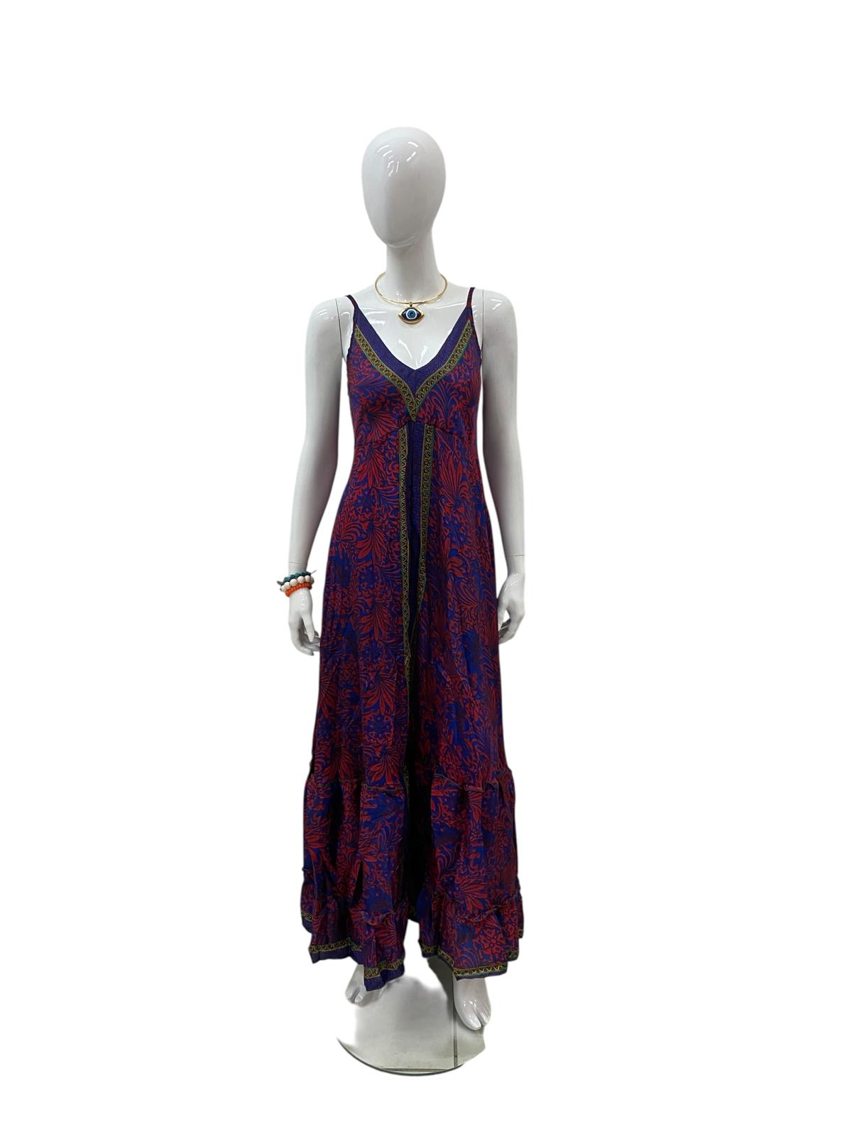 This striking dress radiates bohemian sophistication with its deep, jewel-toned palette of rich purples and reds accented by bold indigo detailing. The V-neckline, framed with contrast borders, elongates the silhouette while lending a touch of structure to the free-flowing design. Its lightweight, airy fabric moves gracefully with every step, making it effortlessly elegant yet relaxed.