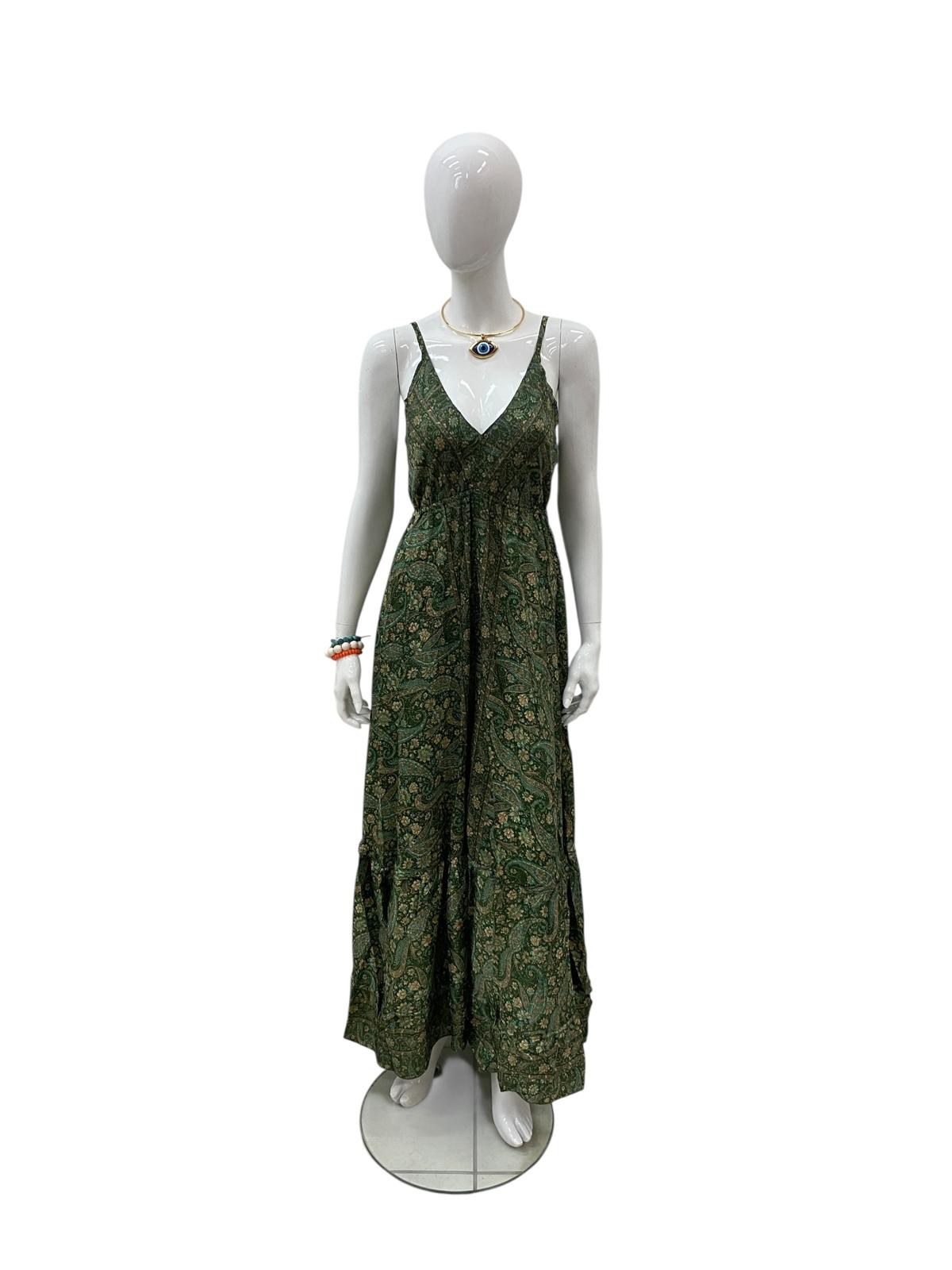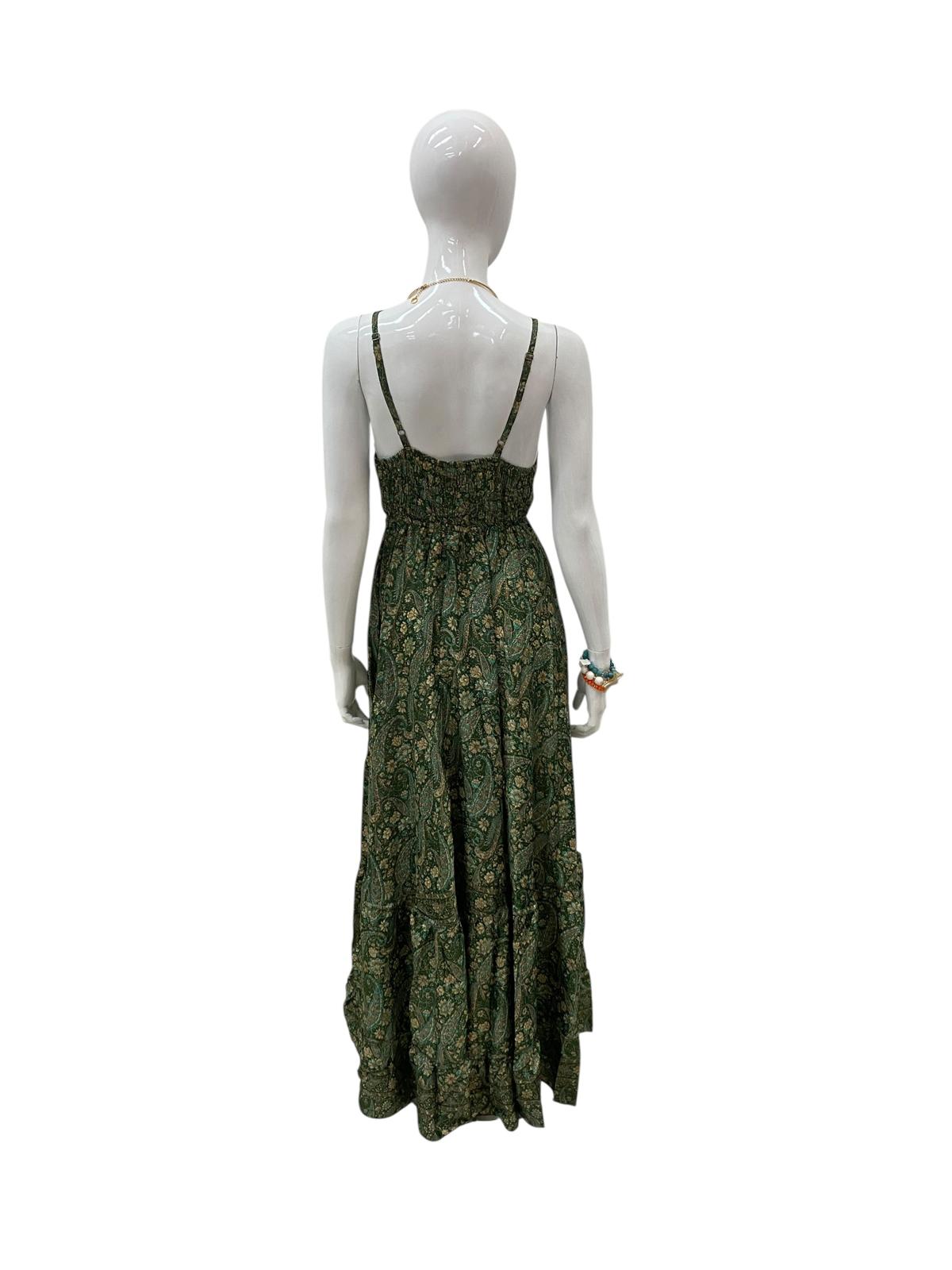 This dark green paisley maxi dress is a stunning blend of elegance and bohemian charm. Its deep tone gives it a sophisticated edge, while the flowing fabric and intricate pattern add a touch of effortless grace. The V-neckline and relaxed fit make it flattering and comfortable, perfect for both casual and semi-dressy occasions. You could wear this dress to an outdoor lunch, a summer festival, or a relaxed evening dinner.