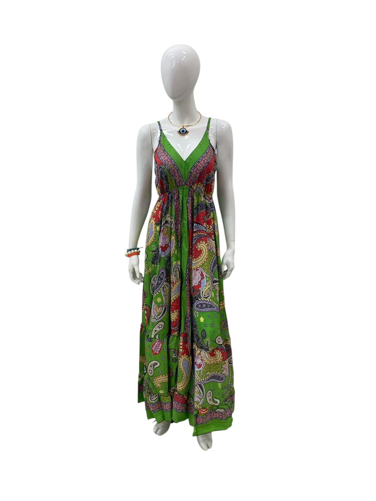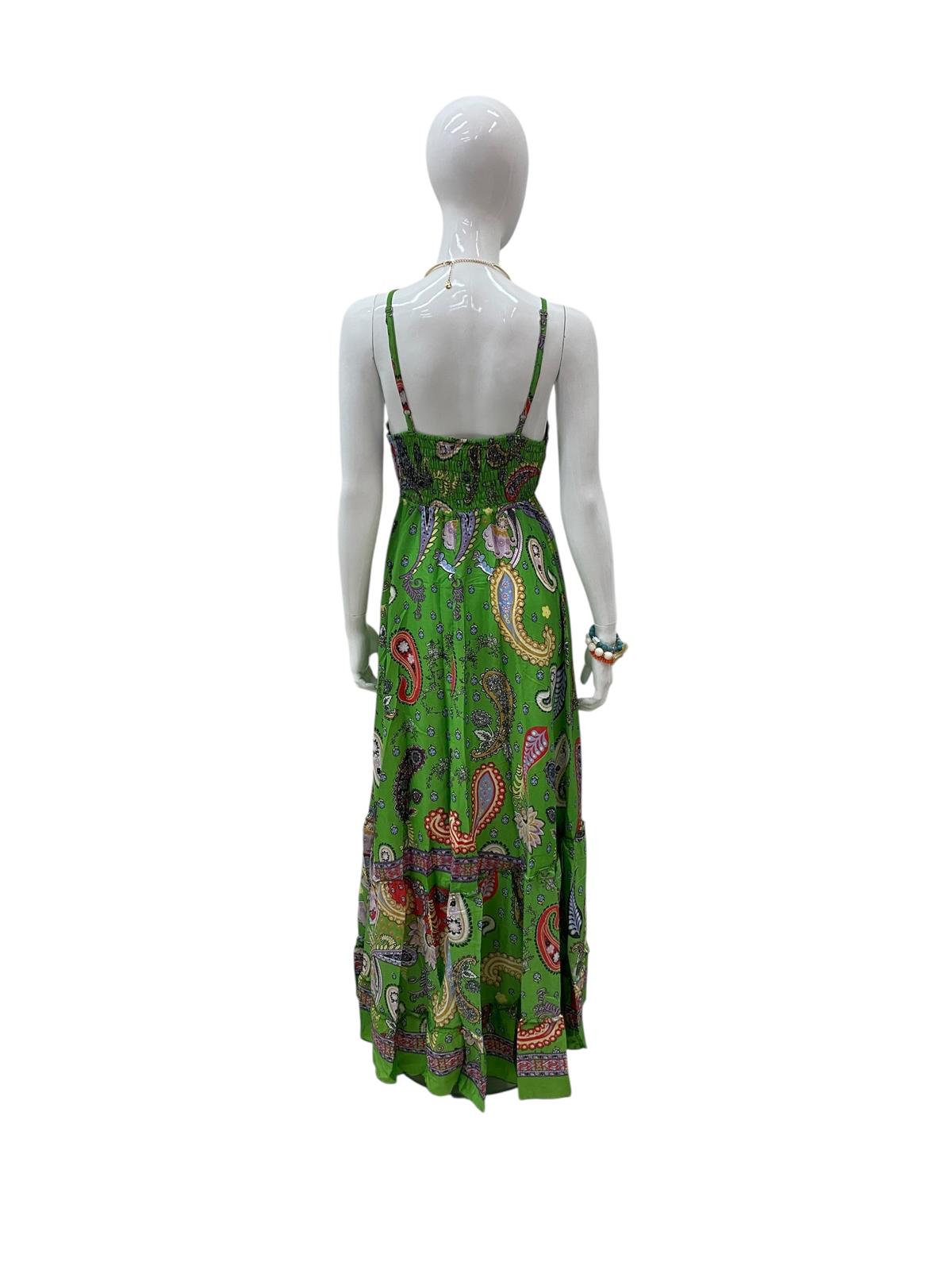 This vibrant green bohemian maxi dress features a colorful paisley print that radiates energy and charm. Its flowing fabric and flattering V-neckline create an effortlessly feminine silhouette, perfect for warm, sunny days. The bold mix of colors and patterns gives it a playful, artistic flair, making it ideal for casual outings like a brunch with friends, a stroll through an outdoor market, or a summer picnic.