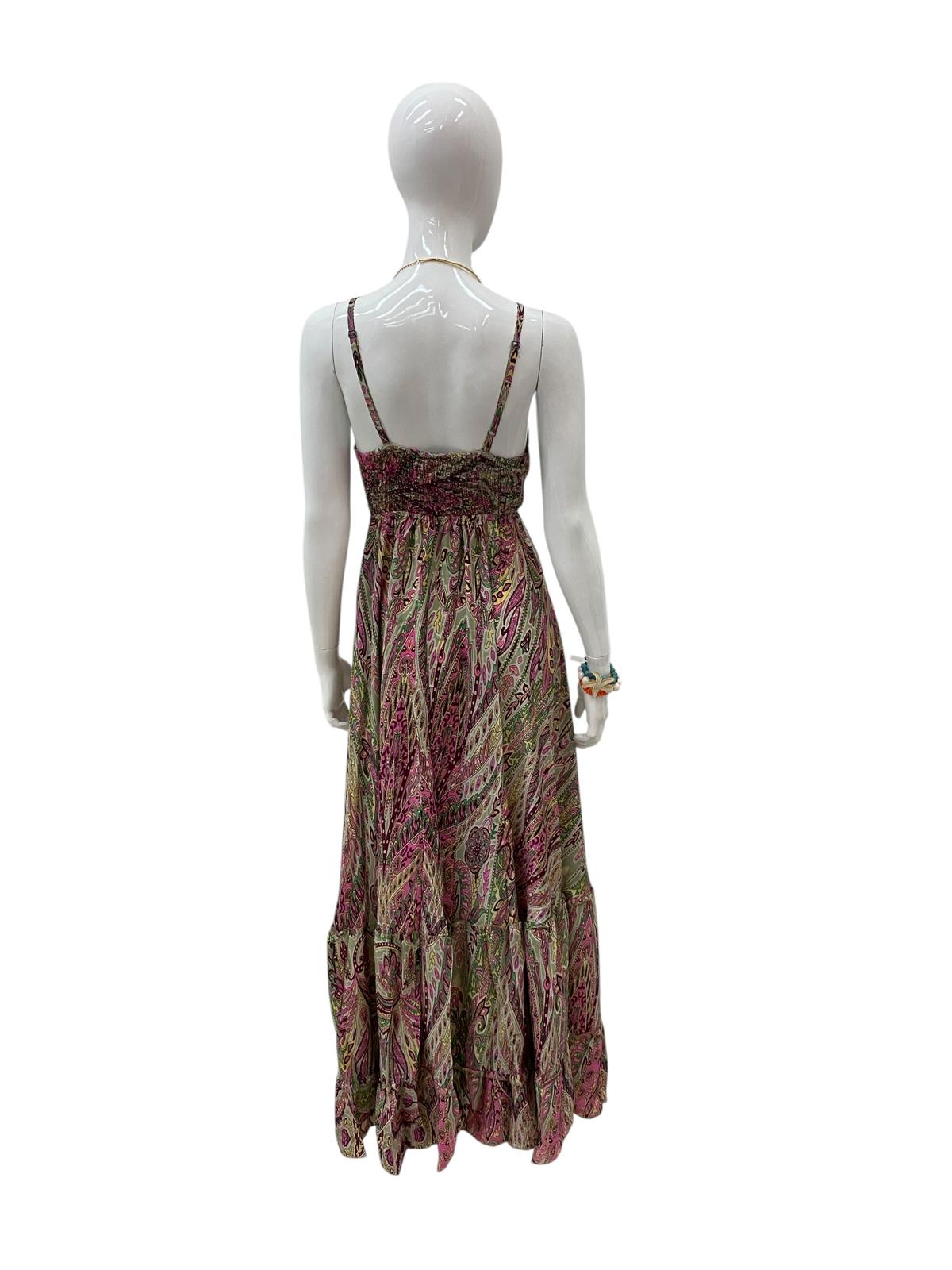 This bohemian-style maxi dress features a mix of pink, olive, and earthy tones in a soft paisley print, creating a look that’s both feminine and free-spirited. The lightweight fabric and flowing silhouette make it perfect for warm days, while the V-neckline and adjustable straps add a flattering, relaxed touch. This dress is ideal for casual summer outings, such as brunch with friends, a weekend market stroll, or a beachside dinner.