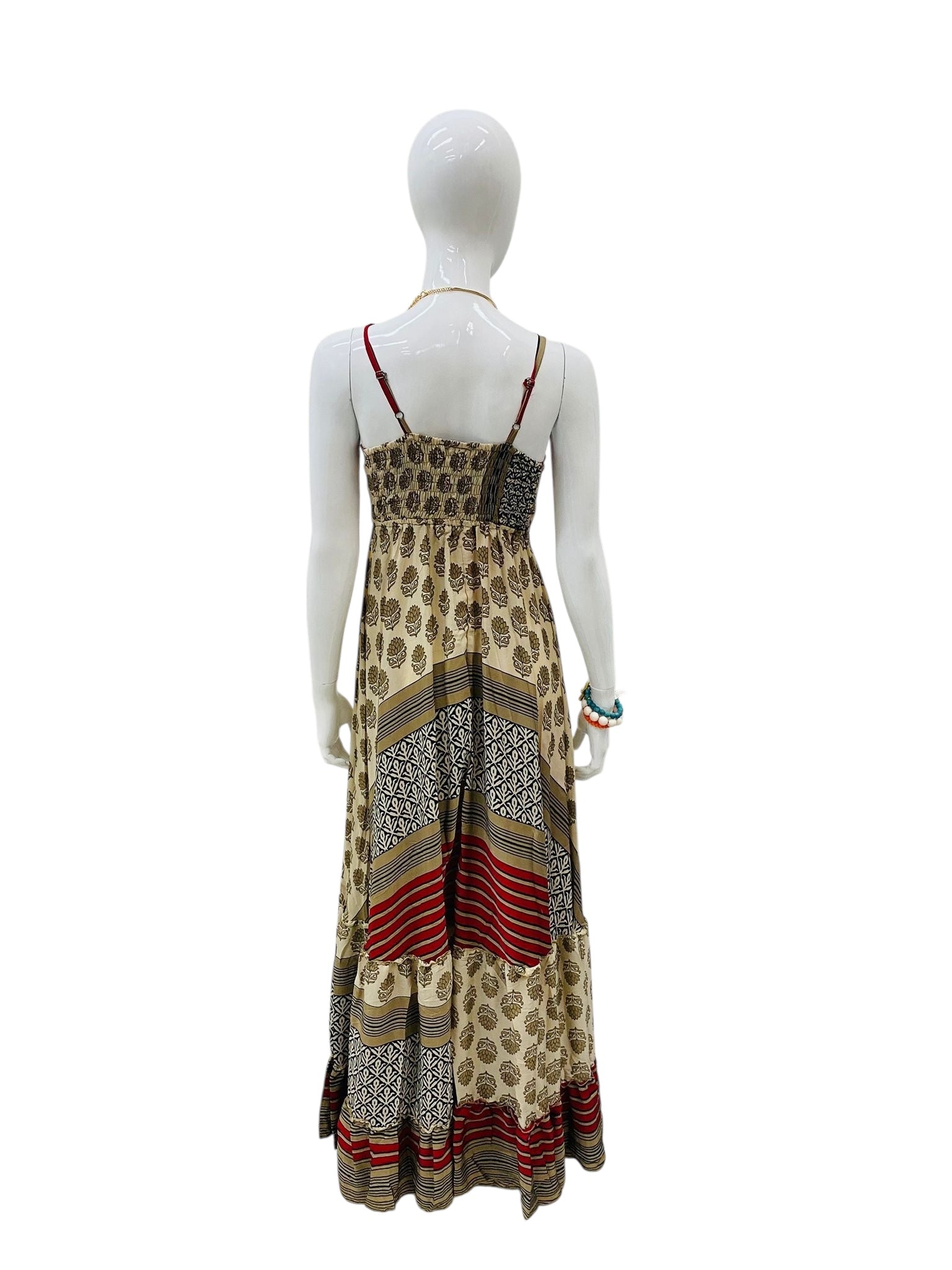 This maxi dress captures a free-spirited elegance with its mix of earthy tones, stripes, and floral-inspired prints. The combination of beige, red, and muted gold gives it a warm, sun-kissed feel, while the deep V-neckline and empire waist create a graceful, elongating silhouette.