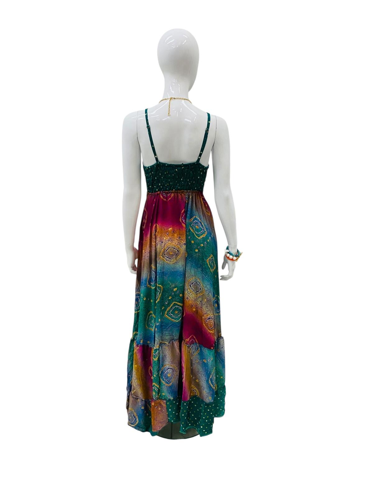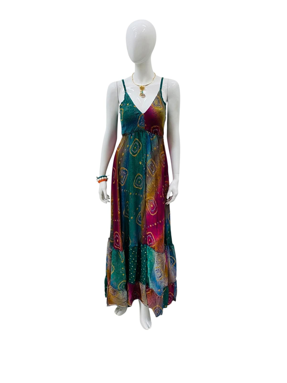 This dress is a stunning celebration of color and creativity, blending jewel-toned panels of teal, magenta, gold, and deep green in an eclectic patchwork design. The flowy silhouette and airy fabric create graceful movement, perfect for warm days or laid-back evenings.