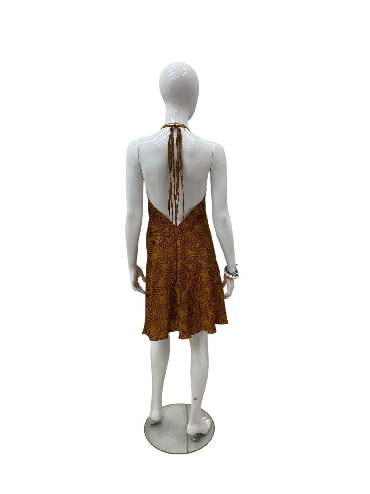 This dress features warm earthy tones with a flowing, lightweight fabric and a halter neckline accented by a contrasting green trim. The swirled pattern adds a subtle bohemian touch, making it both relaxed and elegant.