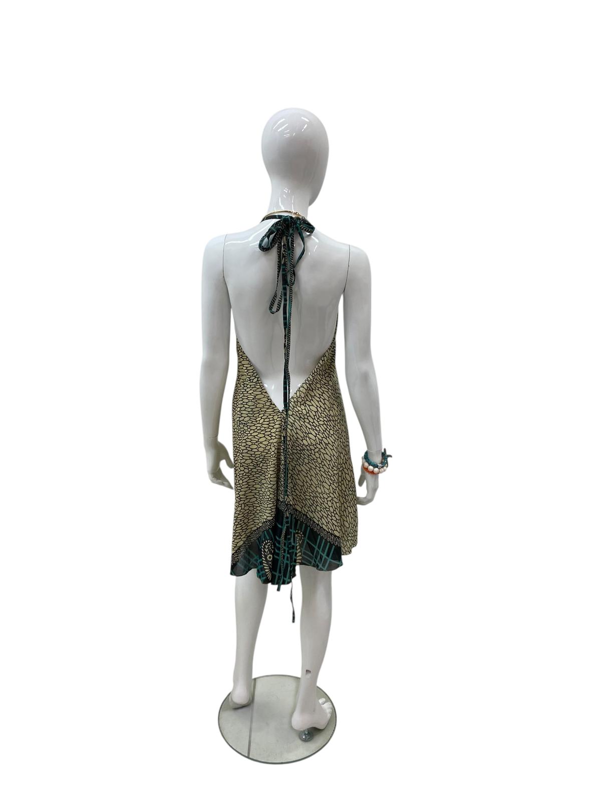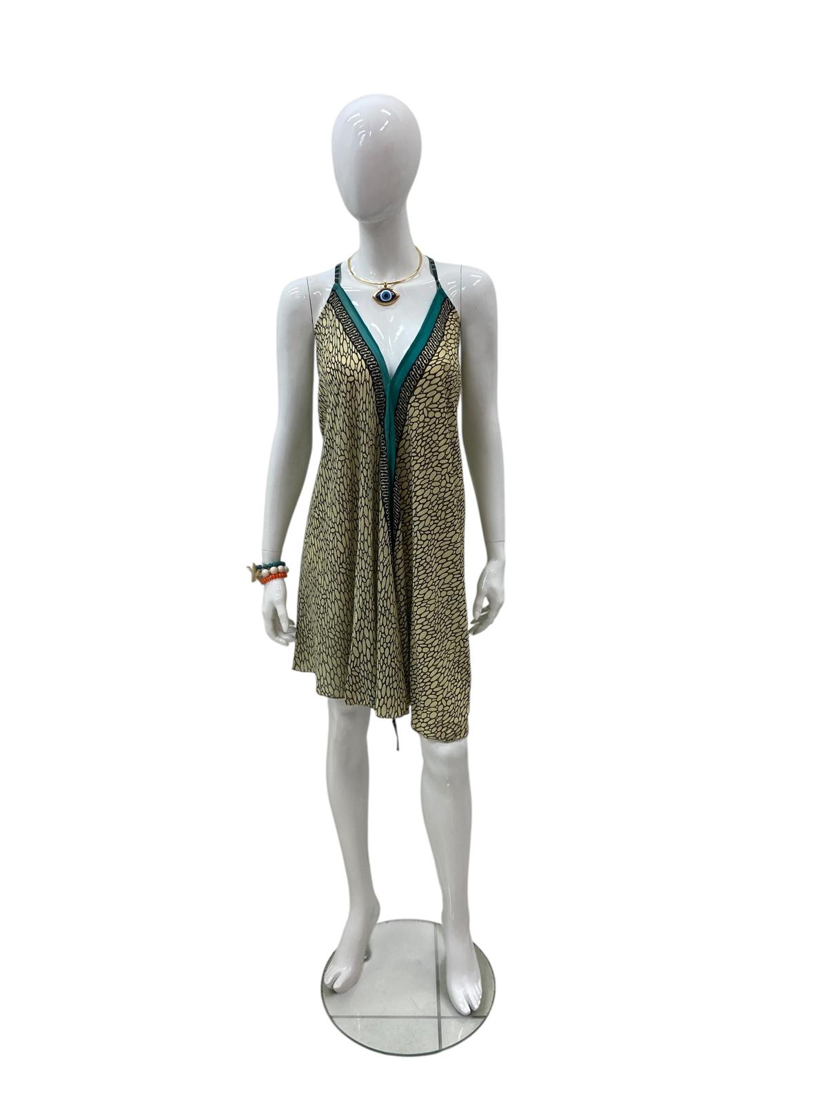 This dress features a delicate neutral print with contrasting teal and black trim that creates a flattering V neckline. The lightweight, airy material gives it a breezy feel — ideal for warm climates.