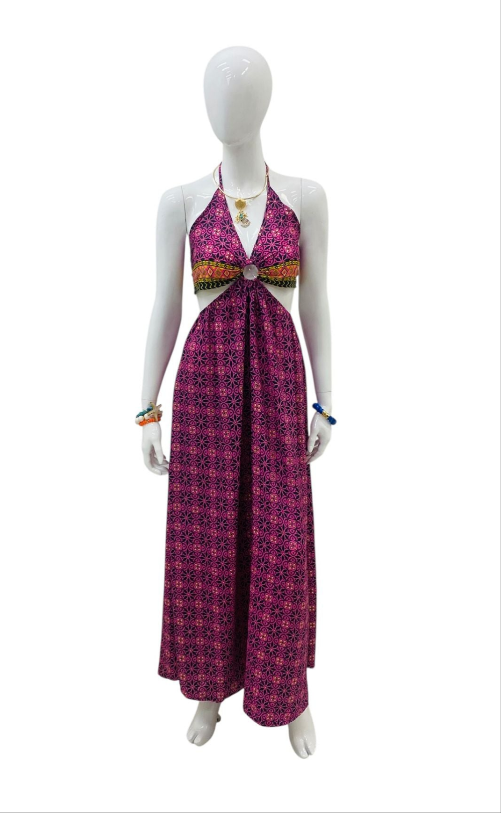 This fuchsia halter maxi dress features a playful bohemian print with a bold midriff cutout, creating a fun yet feminine silhouette. The bright color and relaxed fit make it perfect for warm-weather occasions.