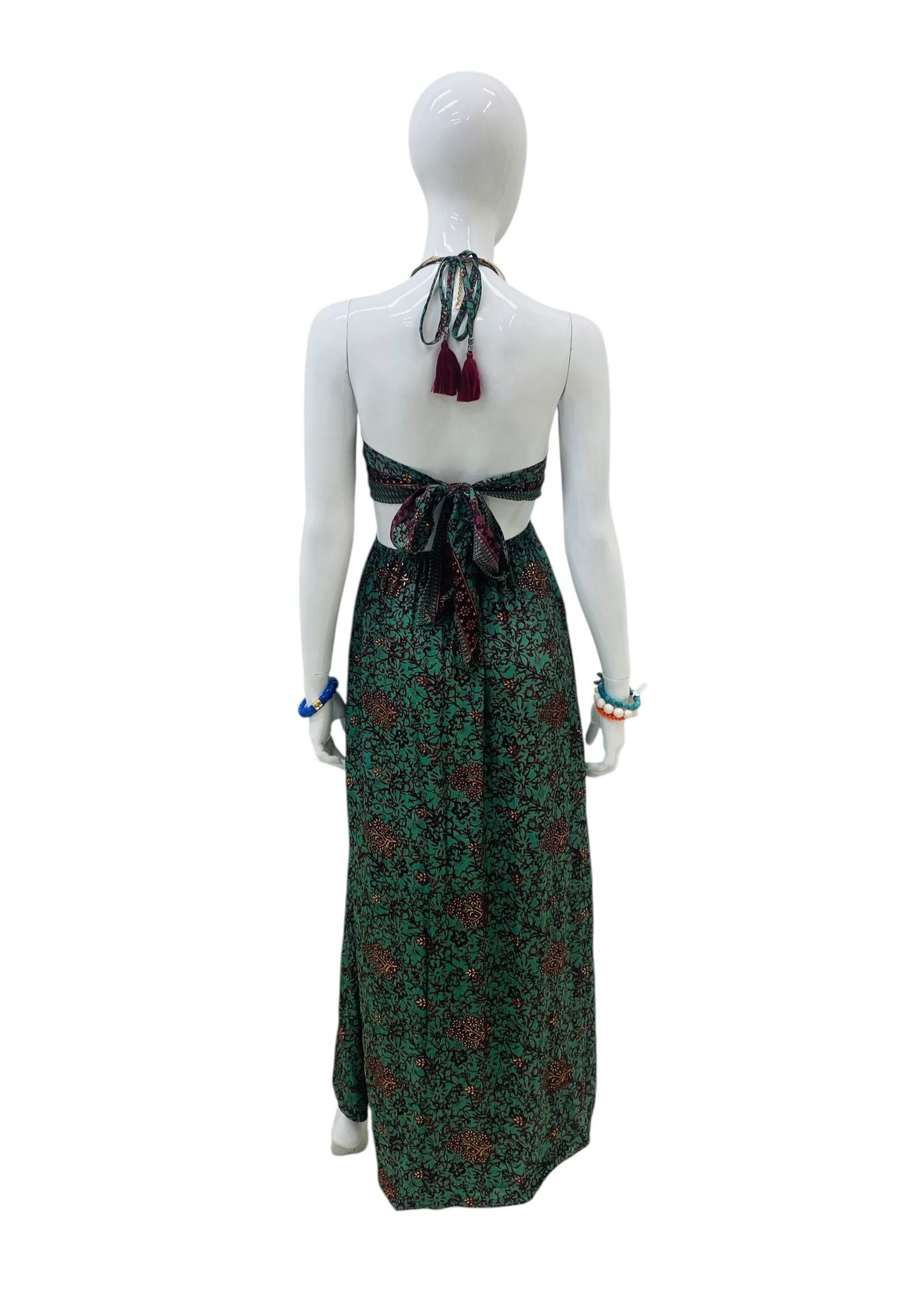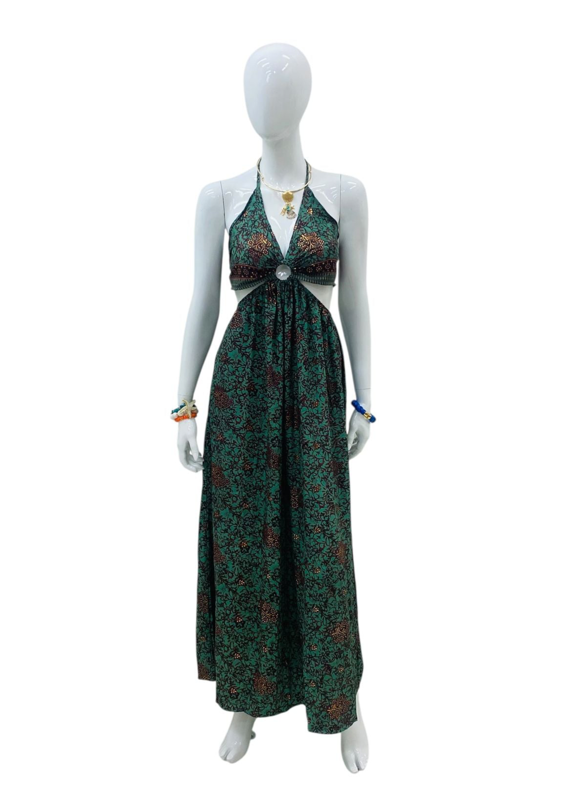 This halter-style maxi dress features a deep neckline, a fitted bodice with a central ring accent, and an elegant flowy skirt. The rich green and rust-toned pattern gives it a tropical yet sophisticated feel, perfect for warm-weather getaways.