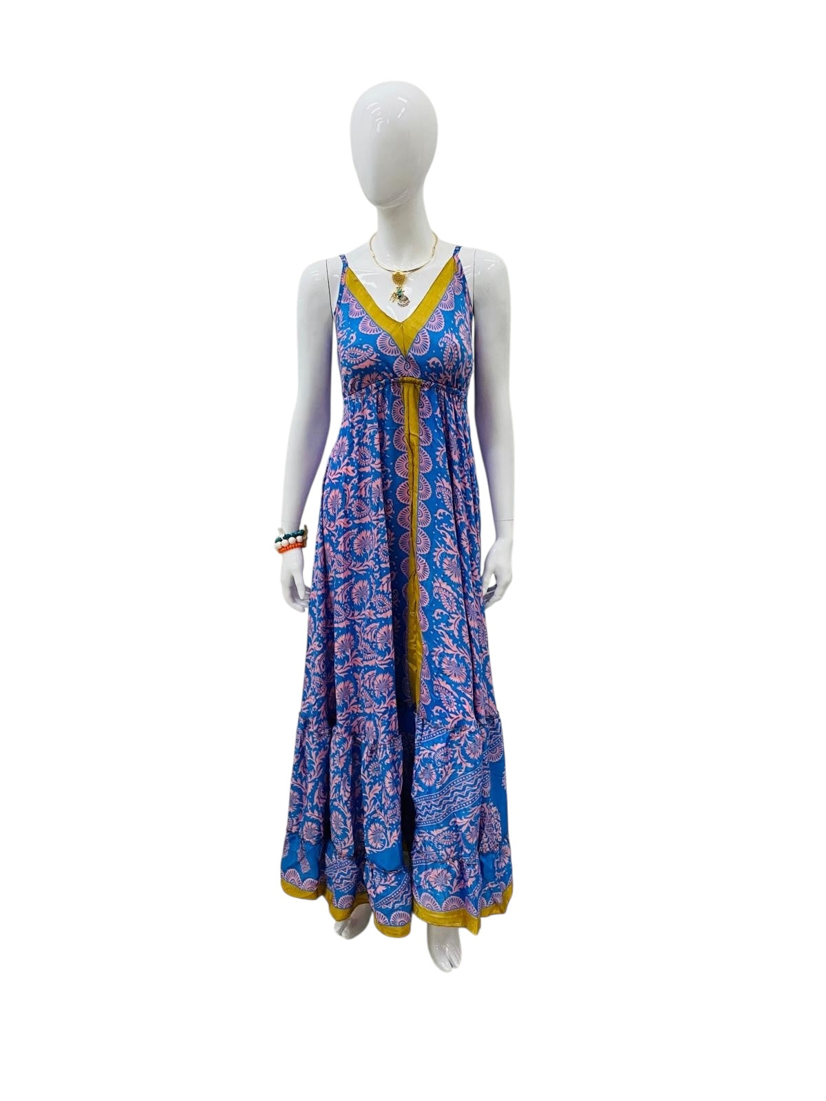 This flowing boho maxi dress captures a breezy, carefree spirit with its vibrant mix of blue and gold hues. The deep V-neckline trimmed with mustard yellow adds a touch of contrast, while the intricate paisley-inspired pattern brings out its playful charm.