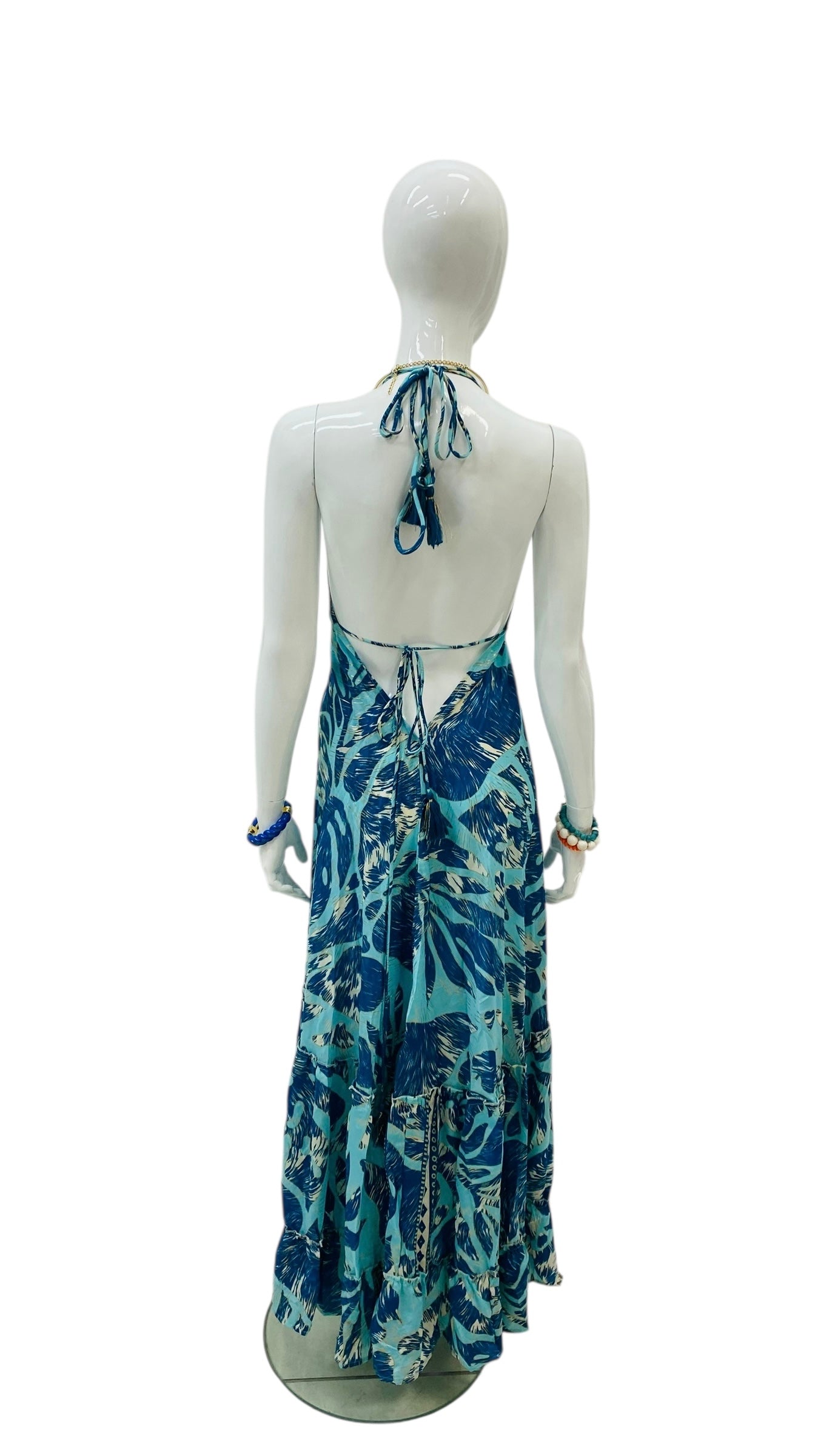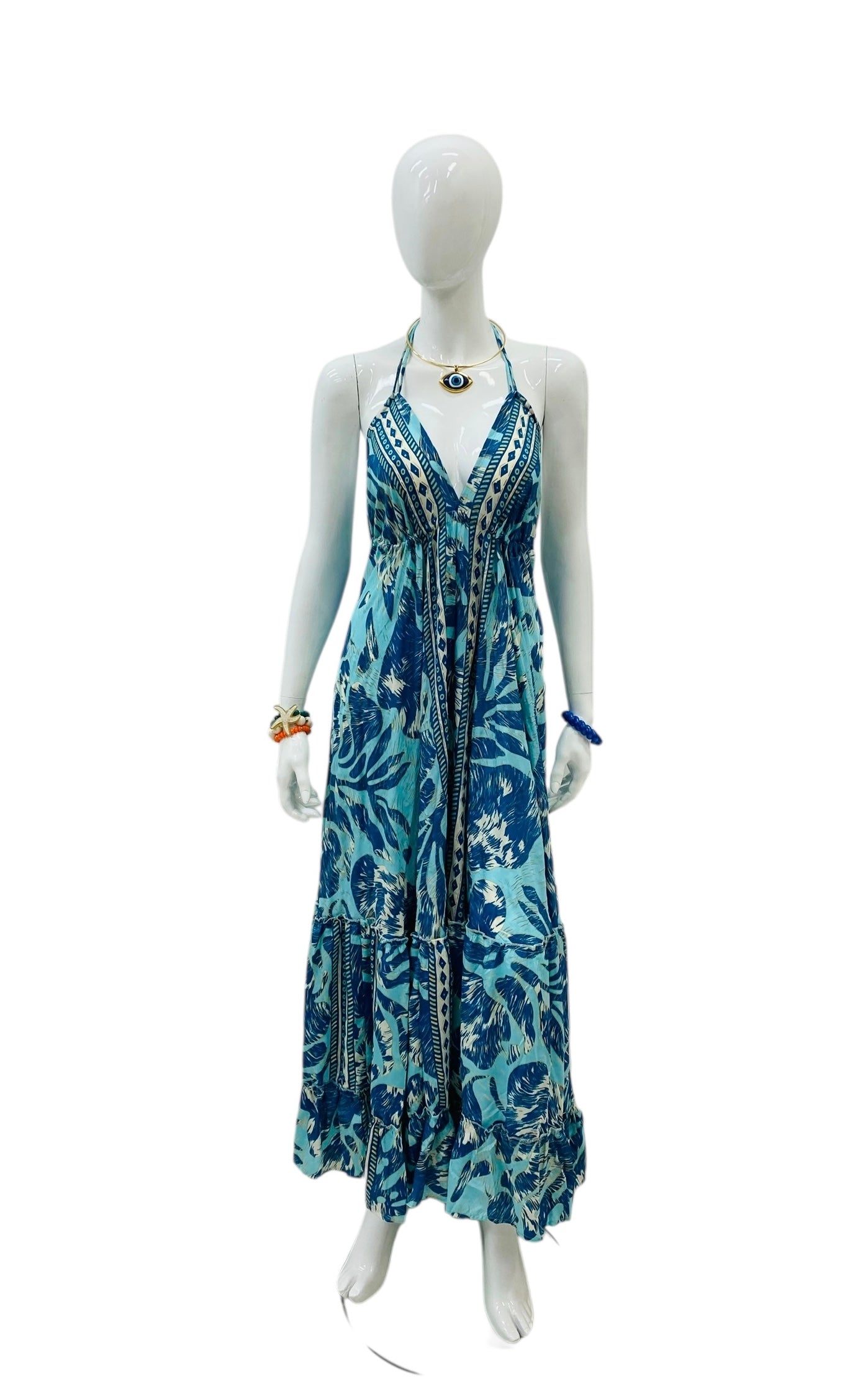 This dress features a cool blue tropical print with a flattering halter neckline and deep V-cut bodice, flowing into a tiered, airy skirt. The relaxed silhouette and lightweight fabric make it an easy choice for warm-weather outings.
