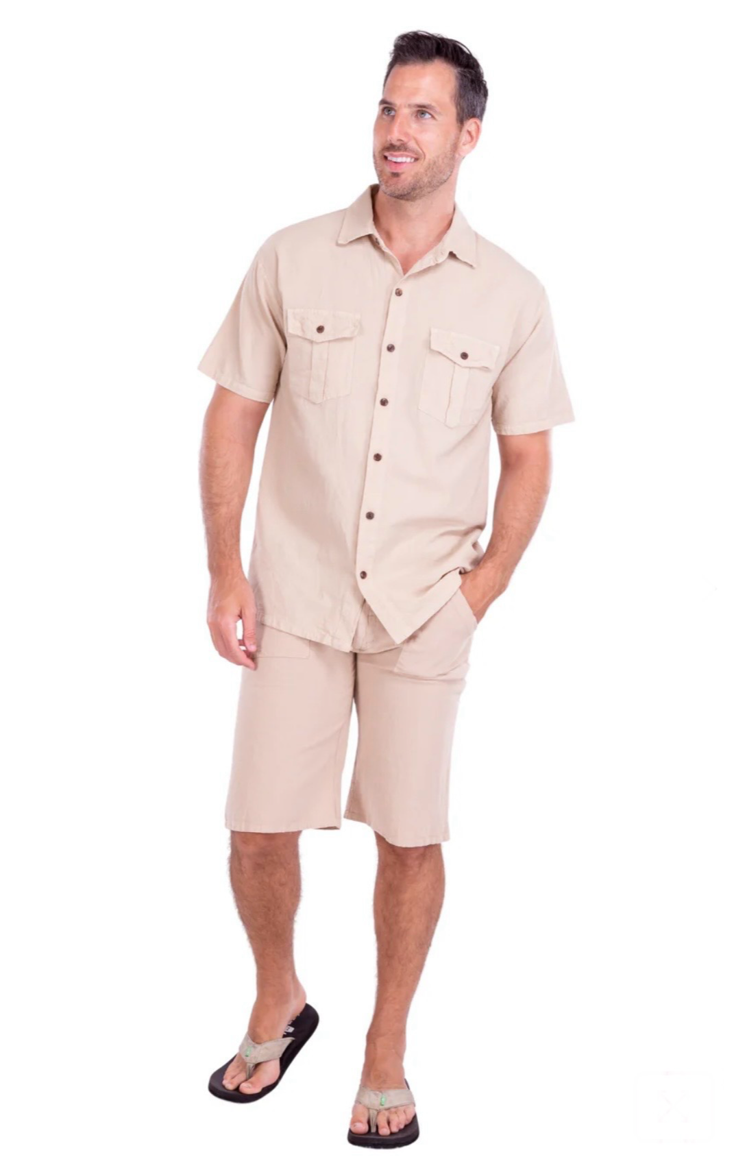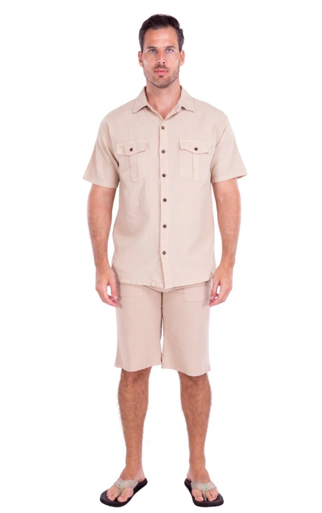 GZ1009 - Beige Cotton Button Down Pockets Shirt.
