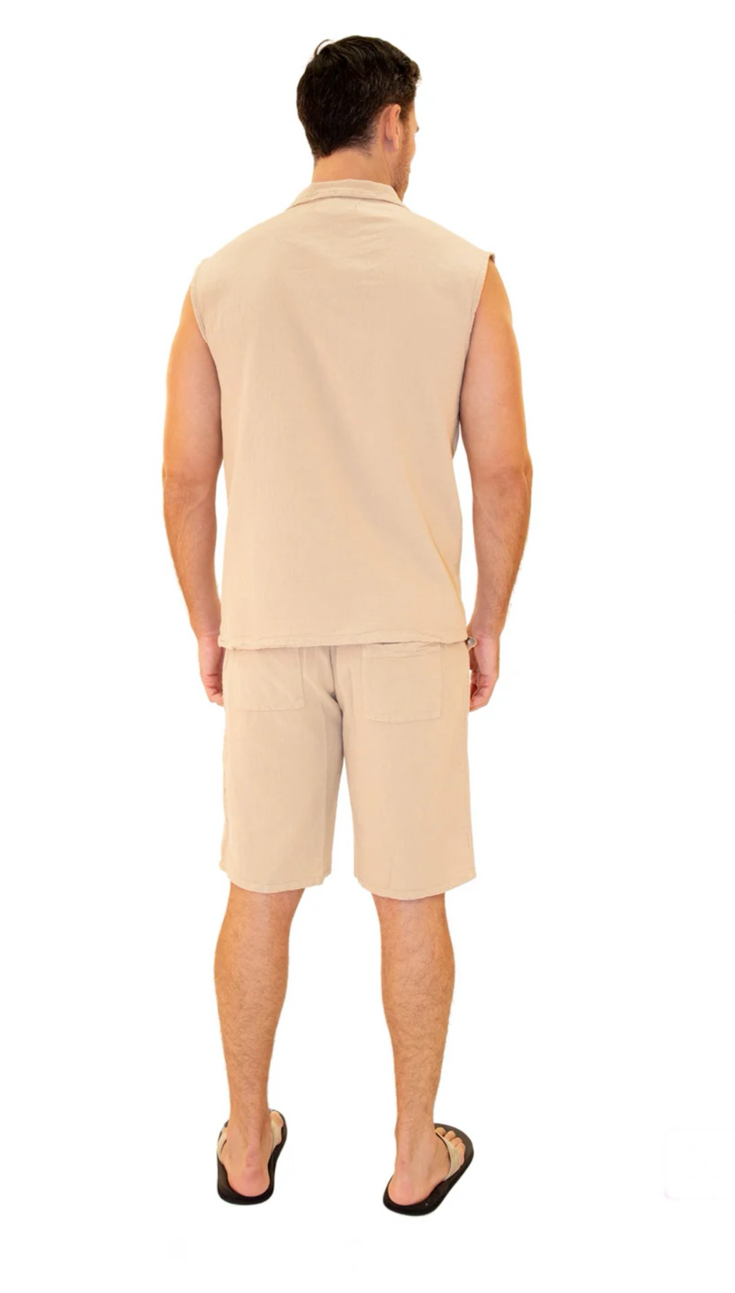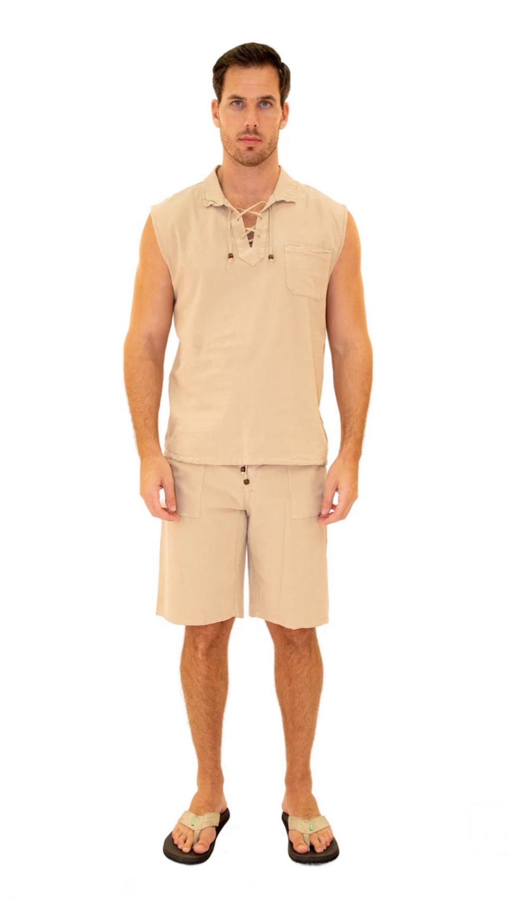 GZ1004 - Beige Cotton Drawstring Pocket Sleeveless Shirt.
