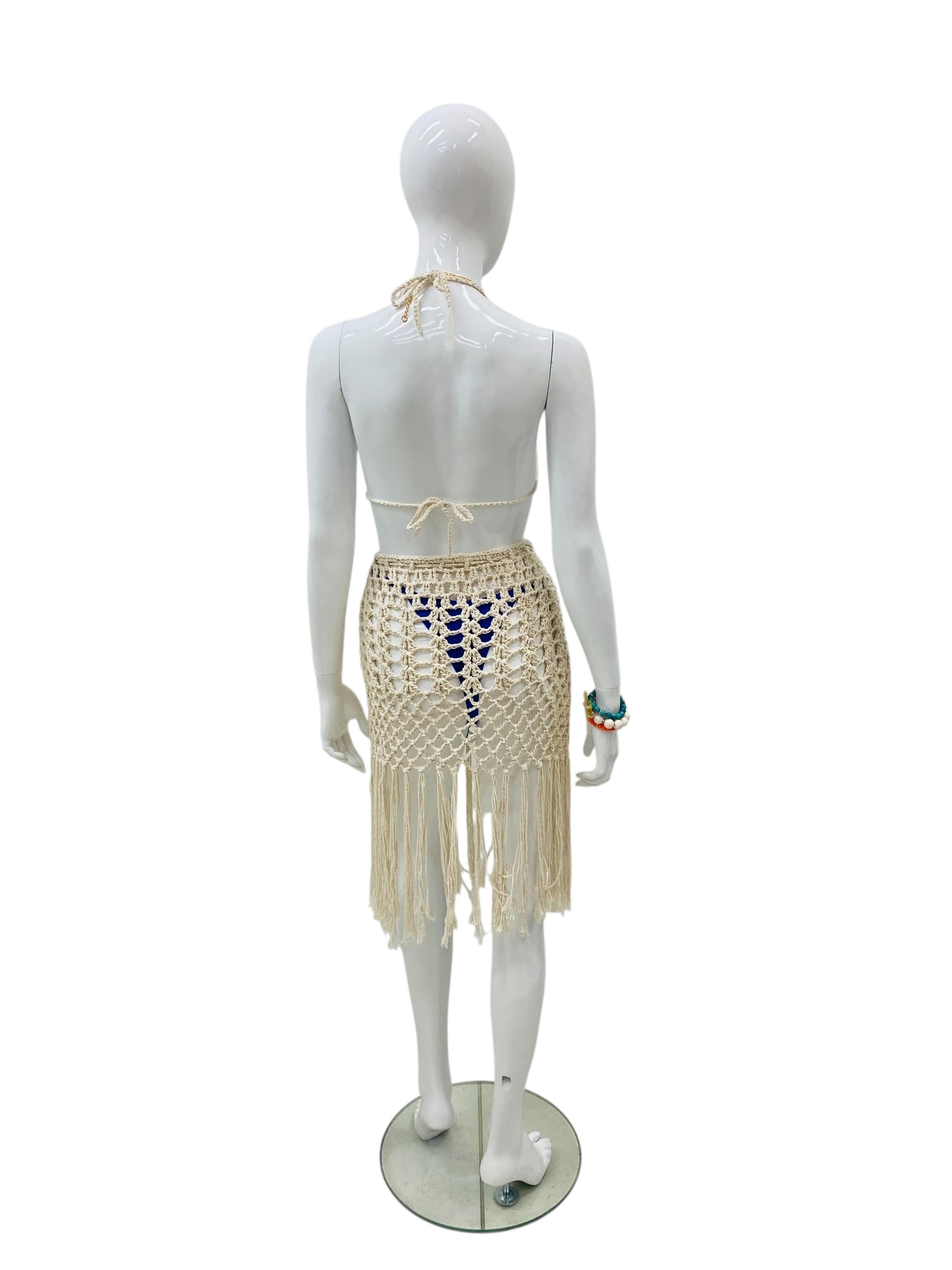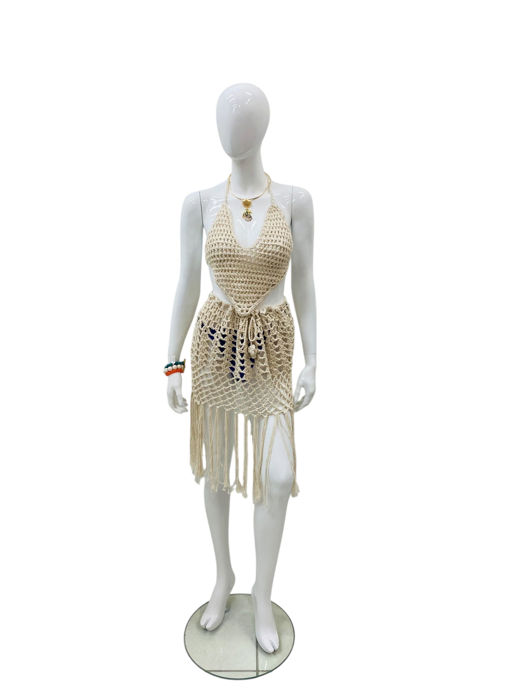 This crochet cover-up features a soft, natural cream tone and a beautifully handwoven look that gives it an effortless boho vibe. The halter-style top provides comfortable support while maintaining an open, breathable design, and the waistline ties create a flattering, cinched silhouette. The skirt transitions into a looser, open-knit pattern with long fringe details that add movement and a touch of drama, letting your swimwear peek through in a stylish, beach-ready way. Perfect for vacations, beach days, poolside lounging, or tropical getaways, it blends comfort, texture, and feminine flair into one effortlessly chic piece.