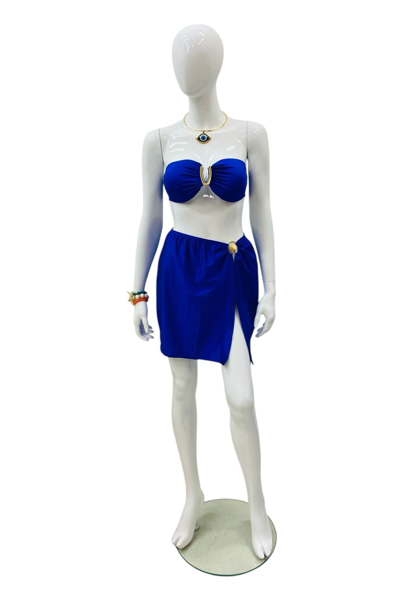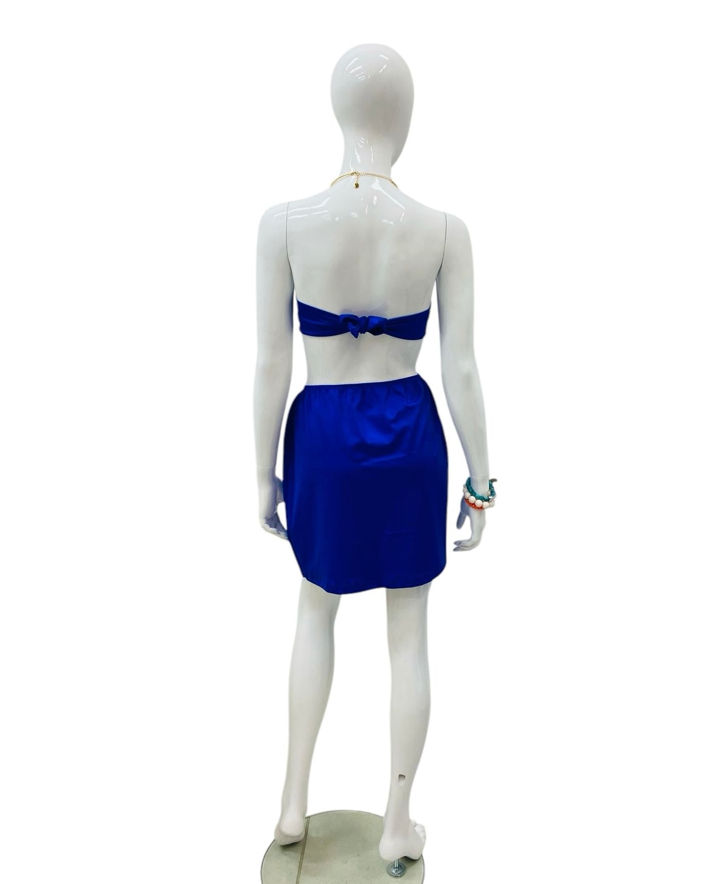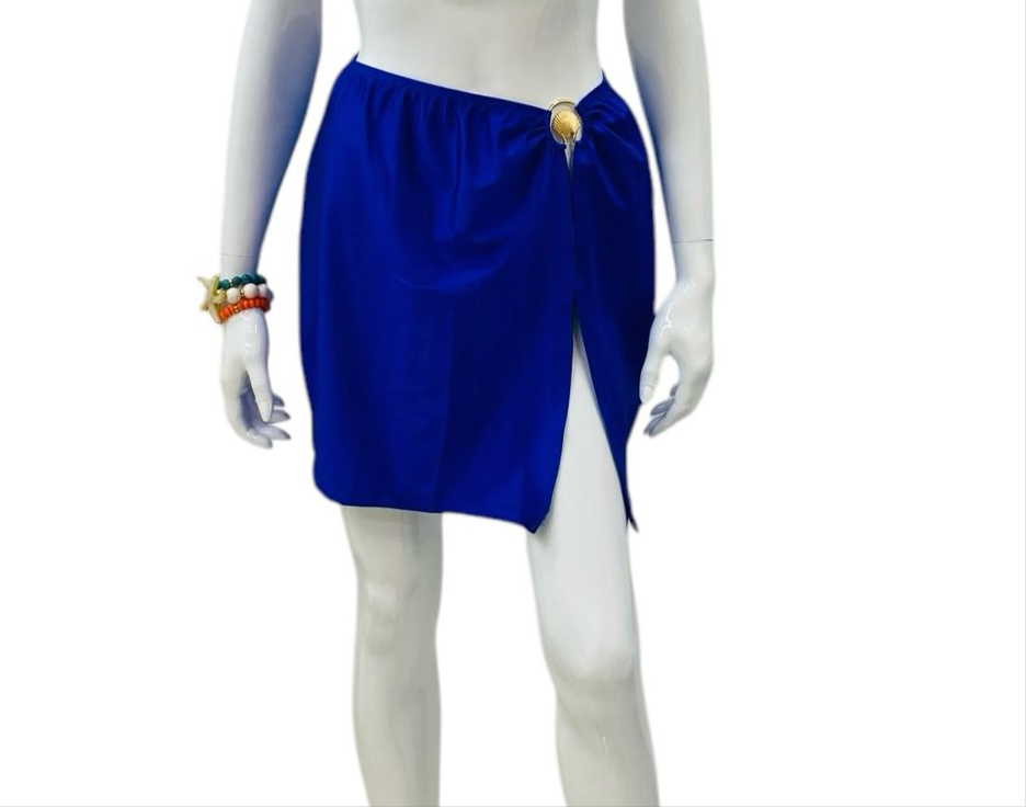 The cover-up skirt shown is a short, wrap-style beach skirt designed in a vibrant royal blue fabric. It features a soft, lightweight material that drapes smoothly around the hips and ties at one side with a decorative gold accent, creating a flattering gathered effect. The skirt has a subtle side slit that adds ease of movement and a touch of allure, making it a stylish and practical layering piece for swimwear or resort outfits.
