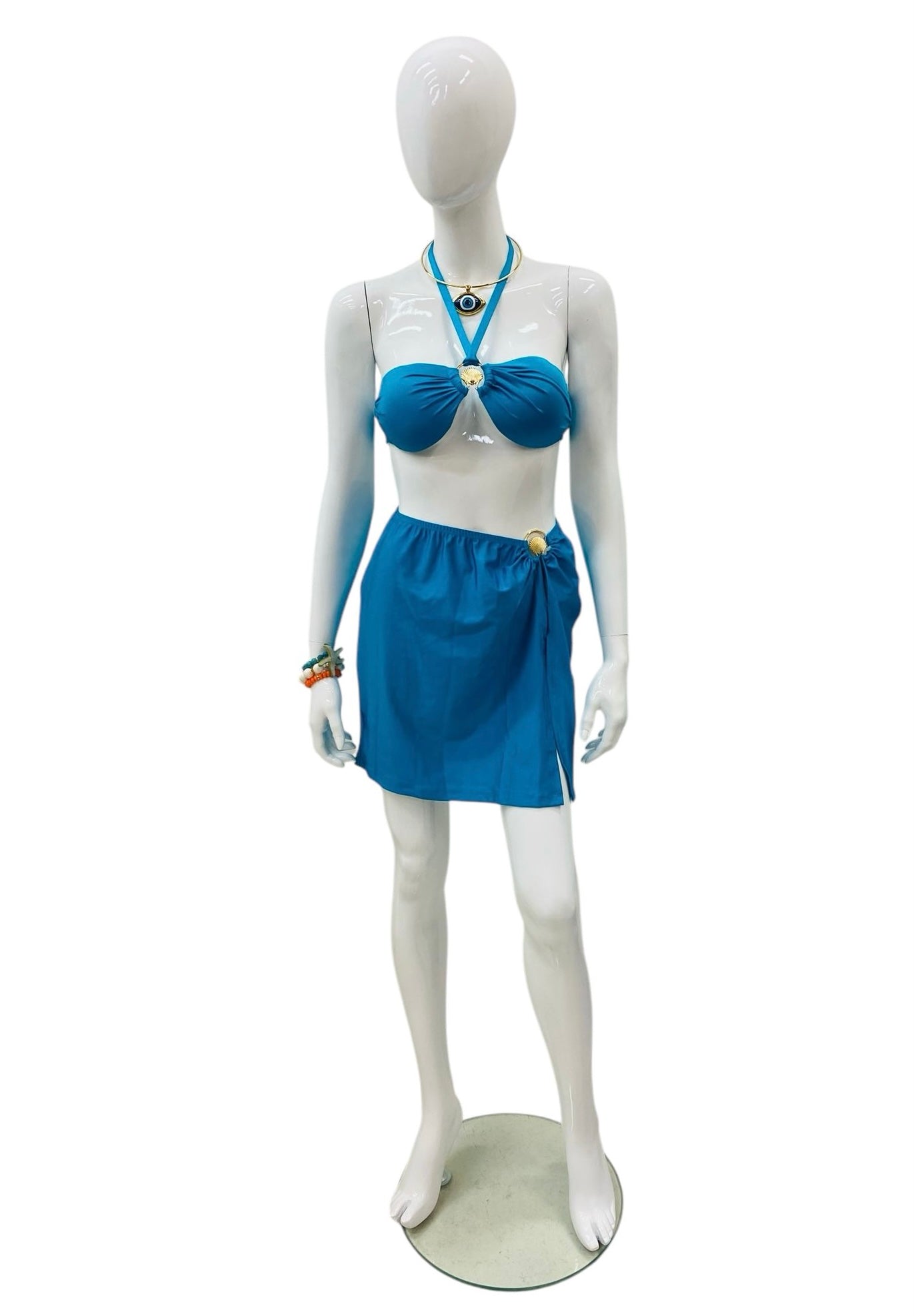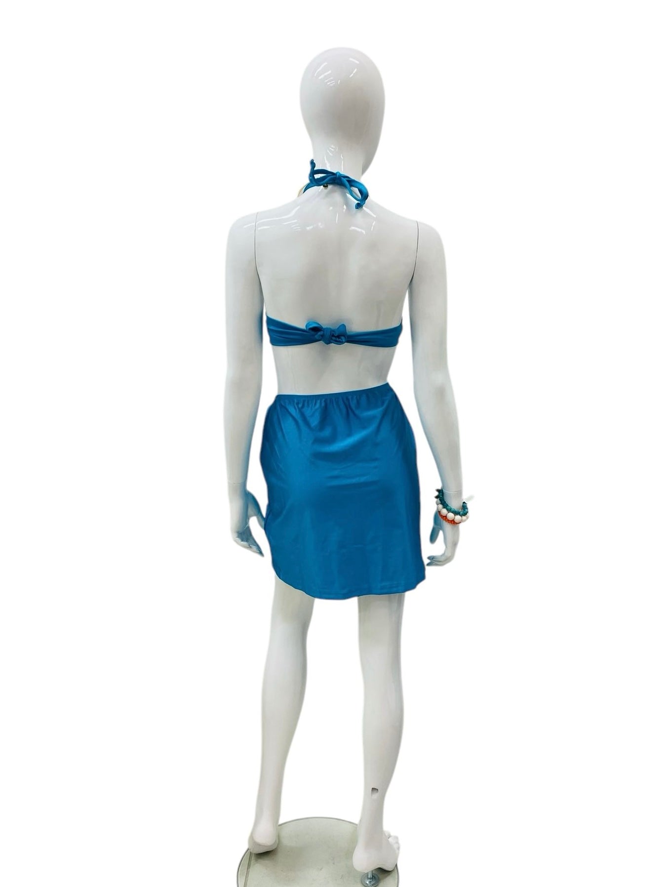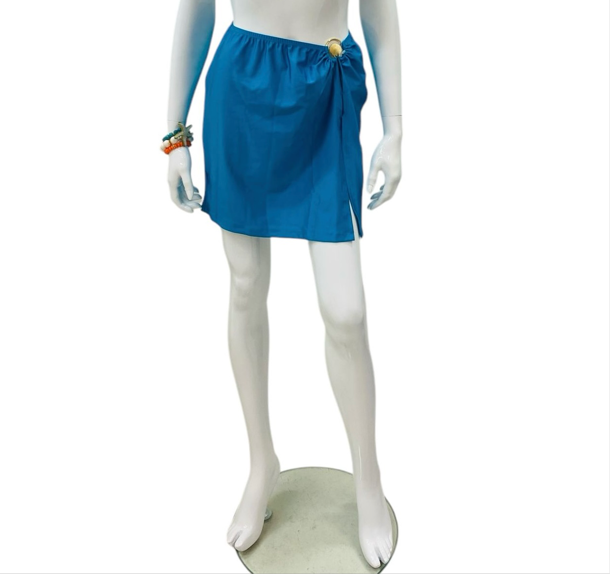 The cover-up skirt is a lightweight, above-the-knee wrap style designed for effortless beach or poolside wear. It features a smooth, flowy fabric in a vibrant aqua blue shade that adds a fresh pop of color. The skirt ties at the hip with a gathered detail secured by a decorative gold accent, creating a flattering draped effect and a subtle side slit. Its easy pull-on design and airy feel make it a chic and practical layer over swimwear.