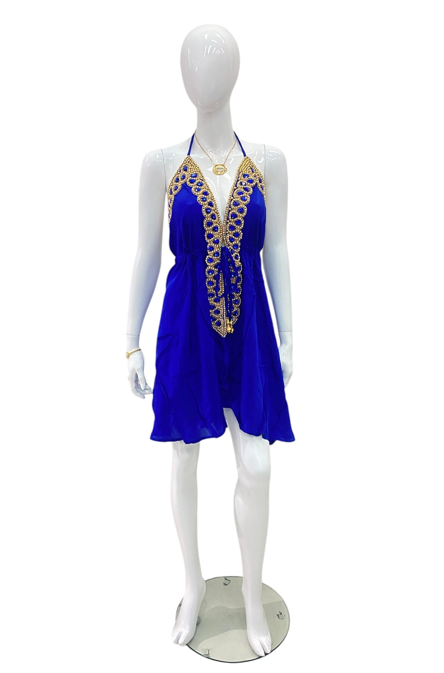 For days when you want the same luxurious, resort-chic energy with a playful, flirtier twist, the short version of this dress brings breezy elegance to warm weather moments. Featuring the same intricate gold and crystal hand-embellished neckline and soft flowing crepe, this mini silhouette flatters effortlessly with its adjustable tie detail and light movement. The shorter length adds a fun, feminine edge while still feeling elevated and polished.