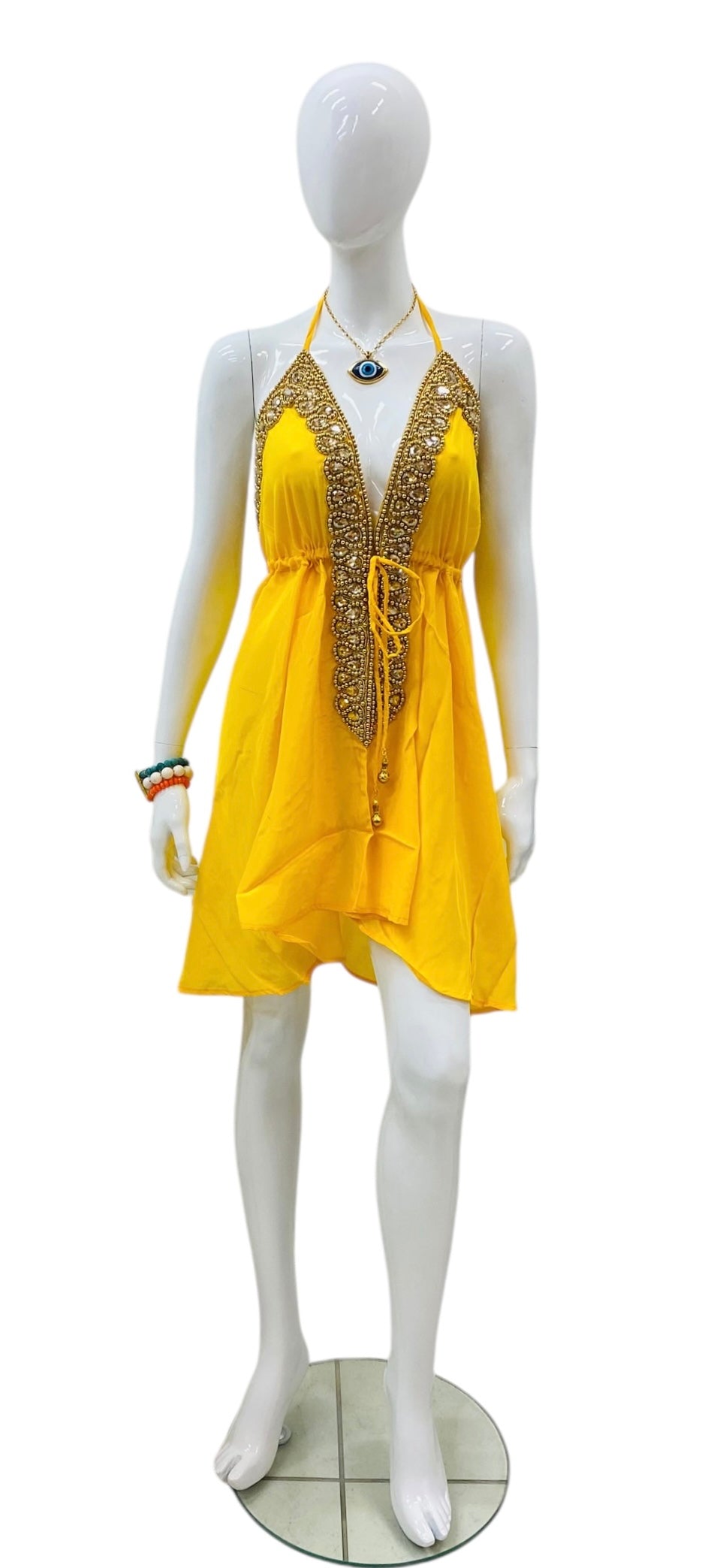 Bright, bold, and effortlessly elegant — this sunshine-yellow hi-lo dress is designed to make you glow. Crafted from soft, flowing viscose crepe, it moves beautifully and drapes with ease. An adjustable mid-tie cinches the waist for a flattering, customizable fit, while the hand-embellished beaded and crystal neckline adds luxe shimmer and artisan detail.