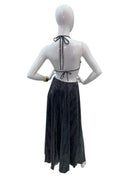 This black maxi dress features a striking halter neckline paired with a bold cutout front that adds a modern, sultry edge to its silhouette. The bodice is designed with a sleek, sculpted fit that transitions into side cutouts, creating a flattering hourglass effect. From the waist down, the dress flows into a long, pleated skirt that drapes beautifully and moves with effortless ease. The gently ruffled hem adds soft texture and dimension, giving the dress a graceful, resort-ready elegance. Perfect for evening outings or vacation nights, this piece blends sophistication with a touch of daring style.