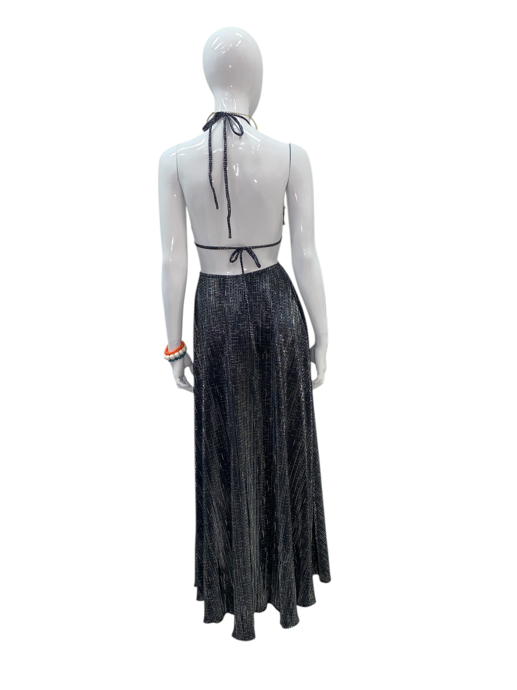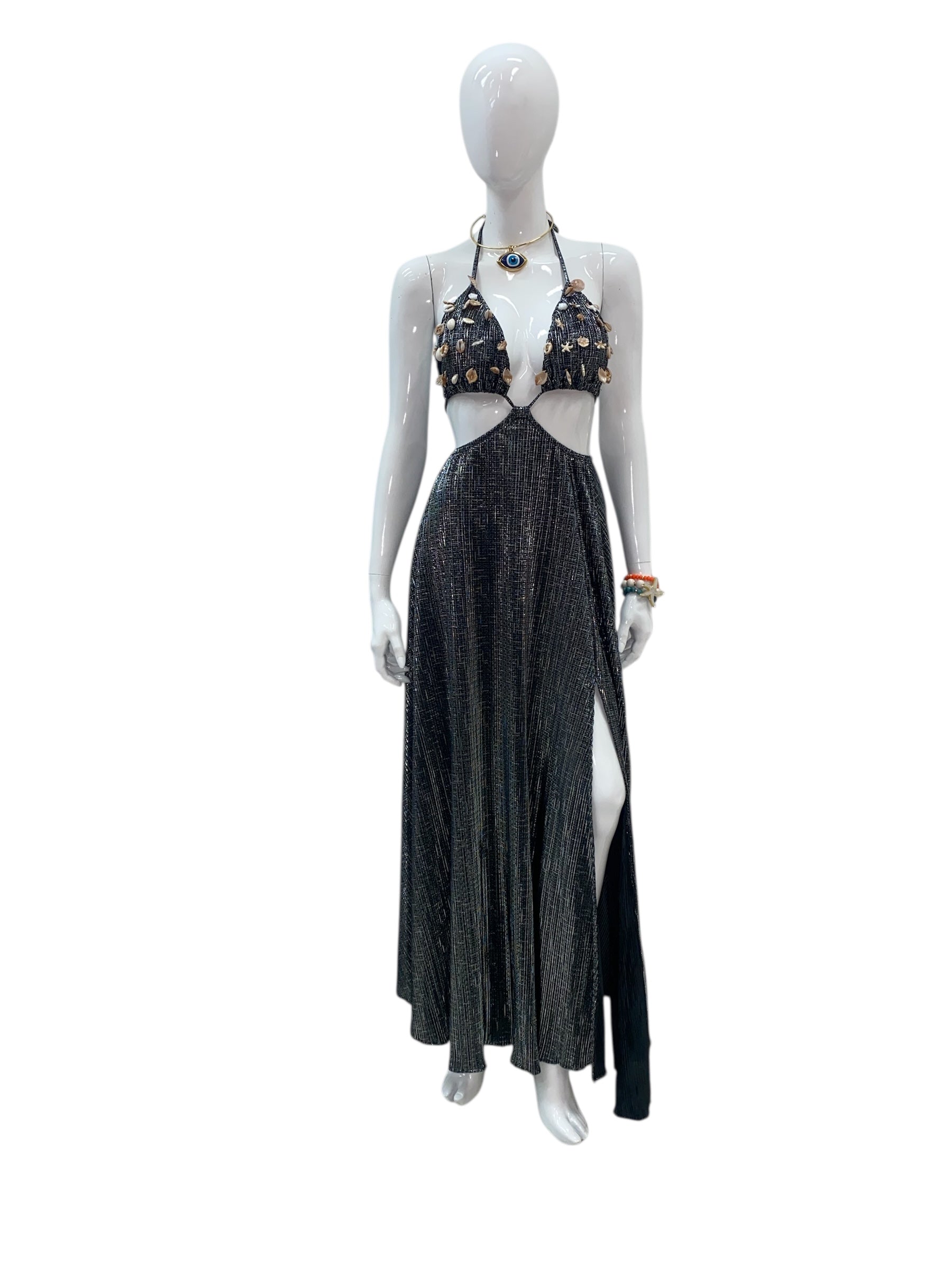 This black maxi dress features a striking halter neckline paired with a bold cutout front that adds a modern, sultry edge to its silhouette. The bodice is designed with a sleek, sculpted fit that transitions into side cutouts, creating a flattering hourglass effect. From the waist down, the dress flows into a long, pleated skirt that drapes beautifully and moves with effortless ease. The gently ruffled hem adds soft texture and dimension, giving the dress a graceful, resort-ready elegance. Perfect for evening outings or vacation nights, this piece blends sophistication with a touch of daring style.