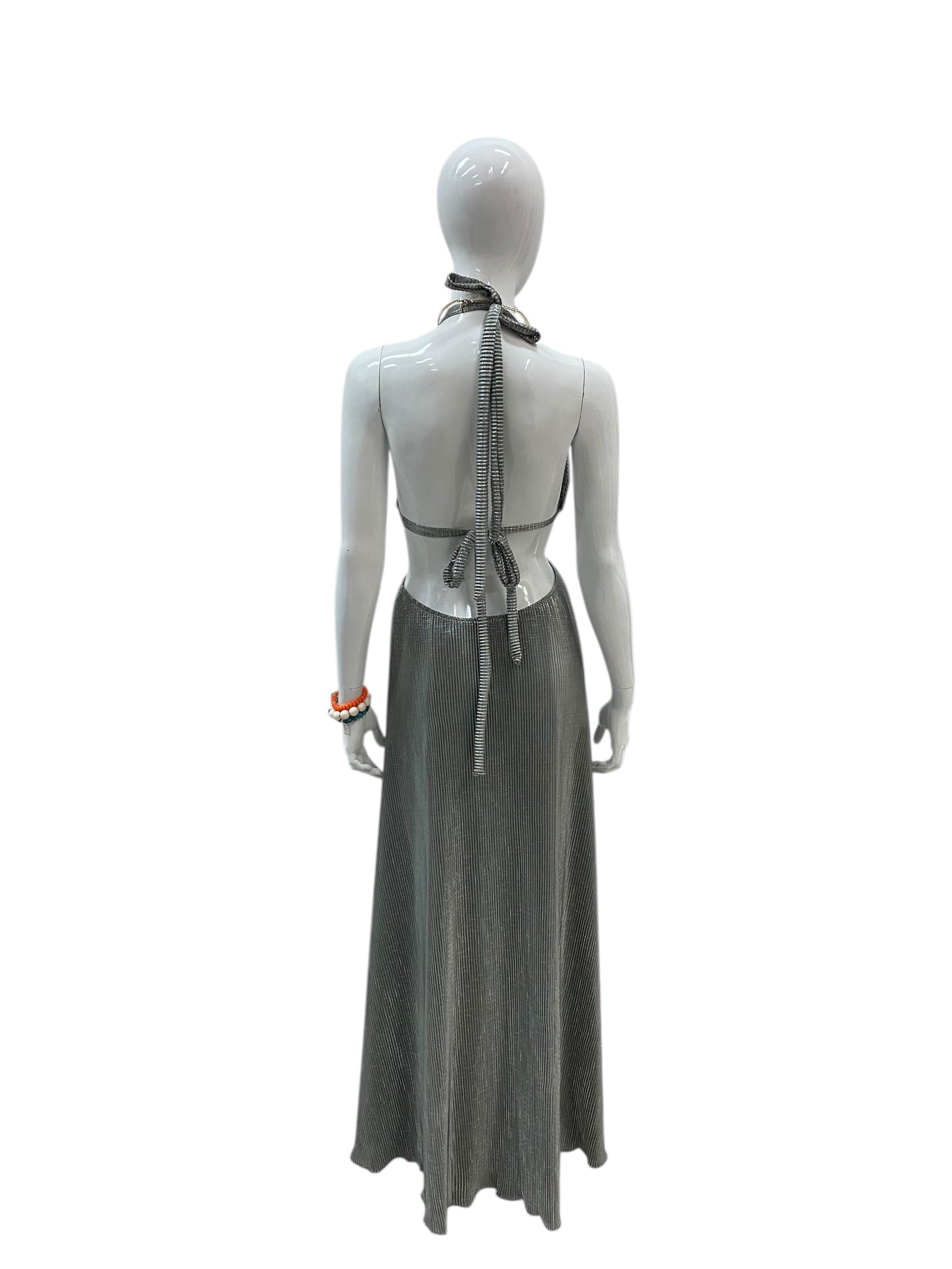This stunning maxi dress features a shimmering, softly textured fabric that drapes beautifully from the bust down to the hem, creating an elegant and flowing silhouette. The top is designed with a chic bralette-style bodice, offering delicate support while highlighting the neckline with slim straps and a flattering, gathered construction. From the empire waist, the dress cascades effortlessly to the floor, giving it a graceful, ethereal movement perfect for beachside evenings or resort wear. Its subtle metallic sheen adds a touch of glamour, making it an eye-catching yet refined statement piece.