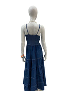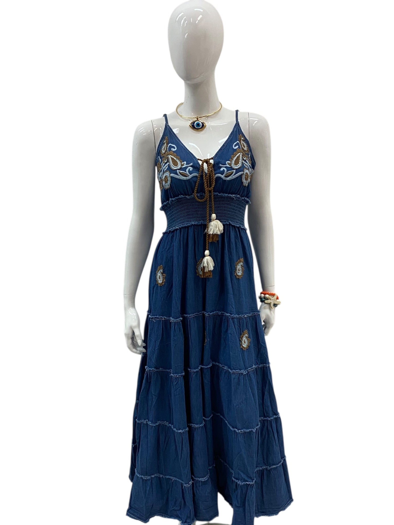 This blue maxi dress features delicate embroidered detailing across the bodice, adding an artisanal, bohemian touch that feels both feminine and refined. Designed with thin adjustable straps and a flattering smocked waist, it gently defines the silhouette while offering comfort and ease. The flowing tiered skirt creates soft movement with every step, making it ideal for beach strolls, daytime events, or relaxed resort evenings. Finished with a tassel tie accent at the front, this piece blends effortless elegance with a carefree, coastal spirit—perfect for warm days and sunset nights.