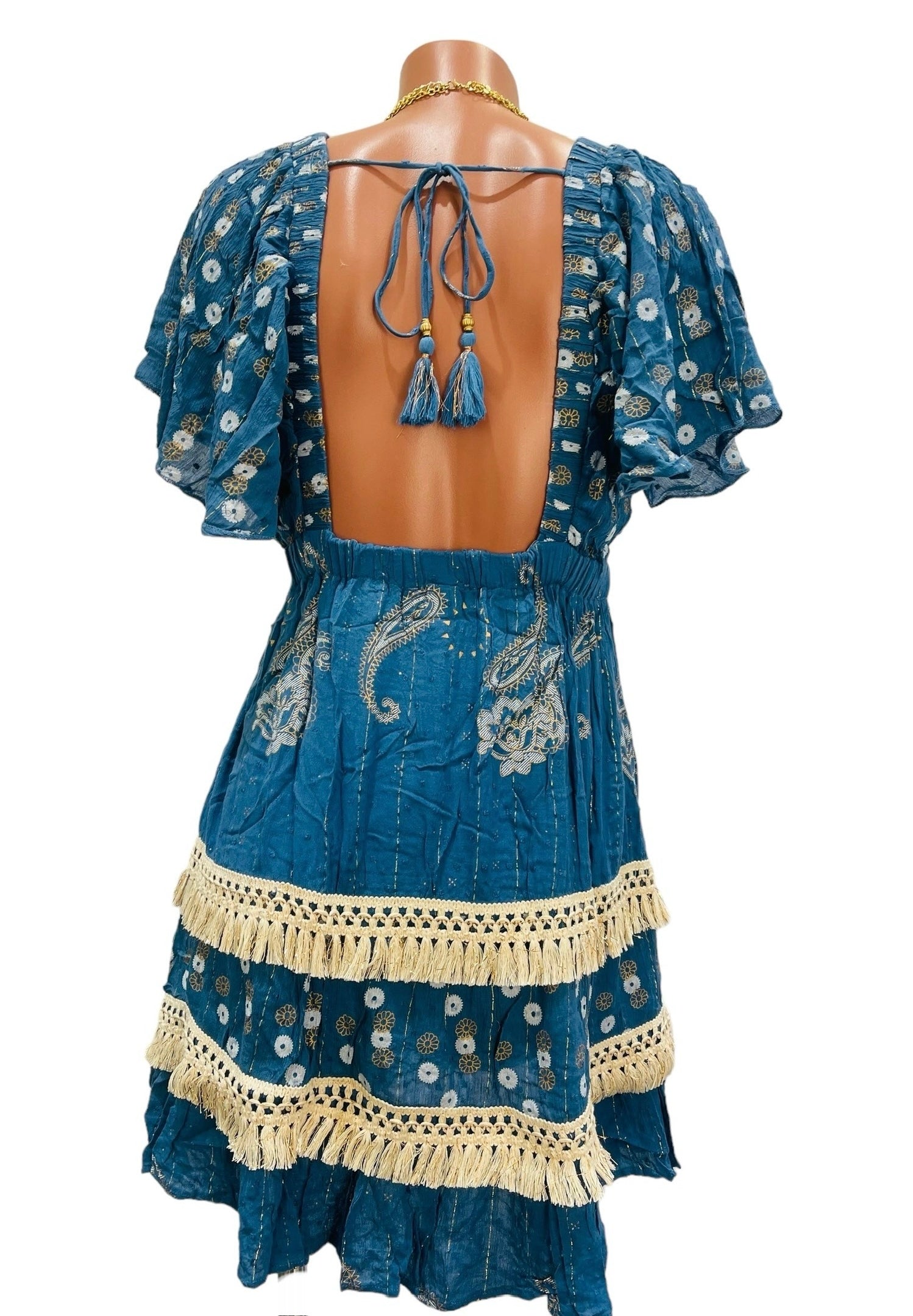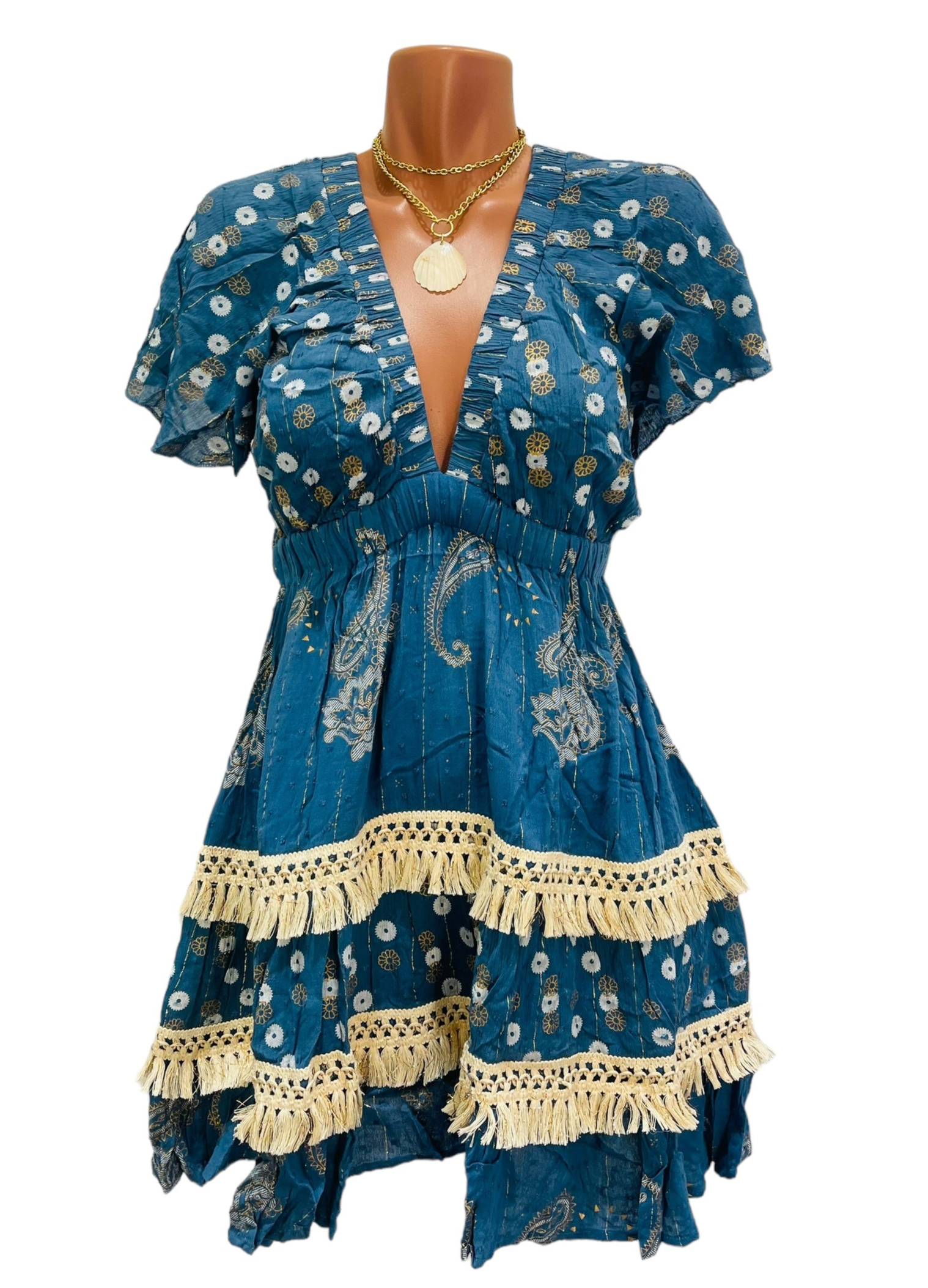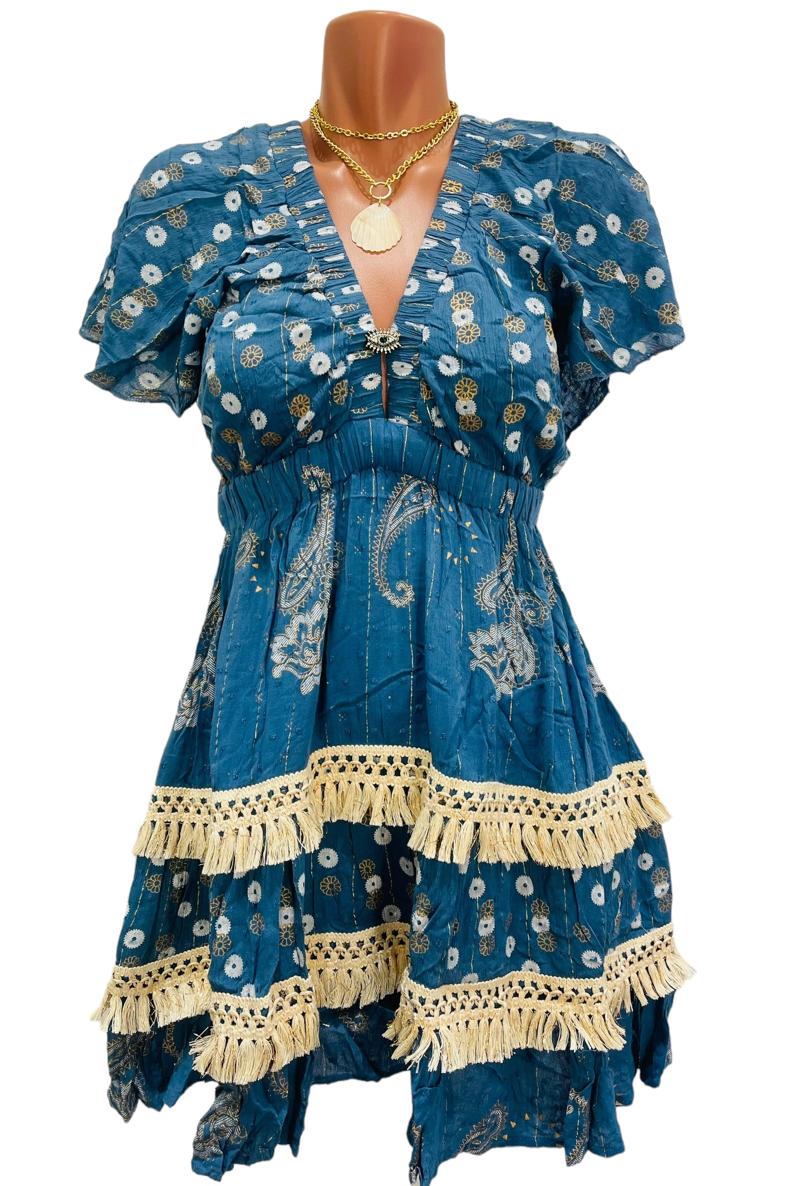 This dress is a little bohemian treasure — rich in color, full of texture, and bursting with personality. The deep teal blue base feels lush and bold, while the metallic floral accents add a touch of shimmer that catches the light in the sweetest, most subtle way. Feminine flutter sleeves and a softly gathered waist create a flattering shape, and the layered skirt finished with delicate cream crochet trim gives it that handcrafted, artisanal charm. It feels playful and romantic at the same time — like something discovered on a sun-drenched trip to a coastal market.