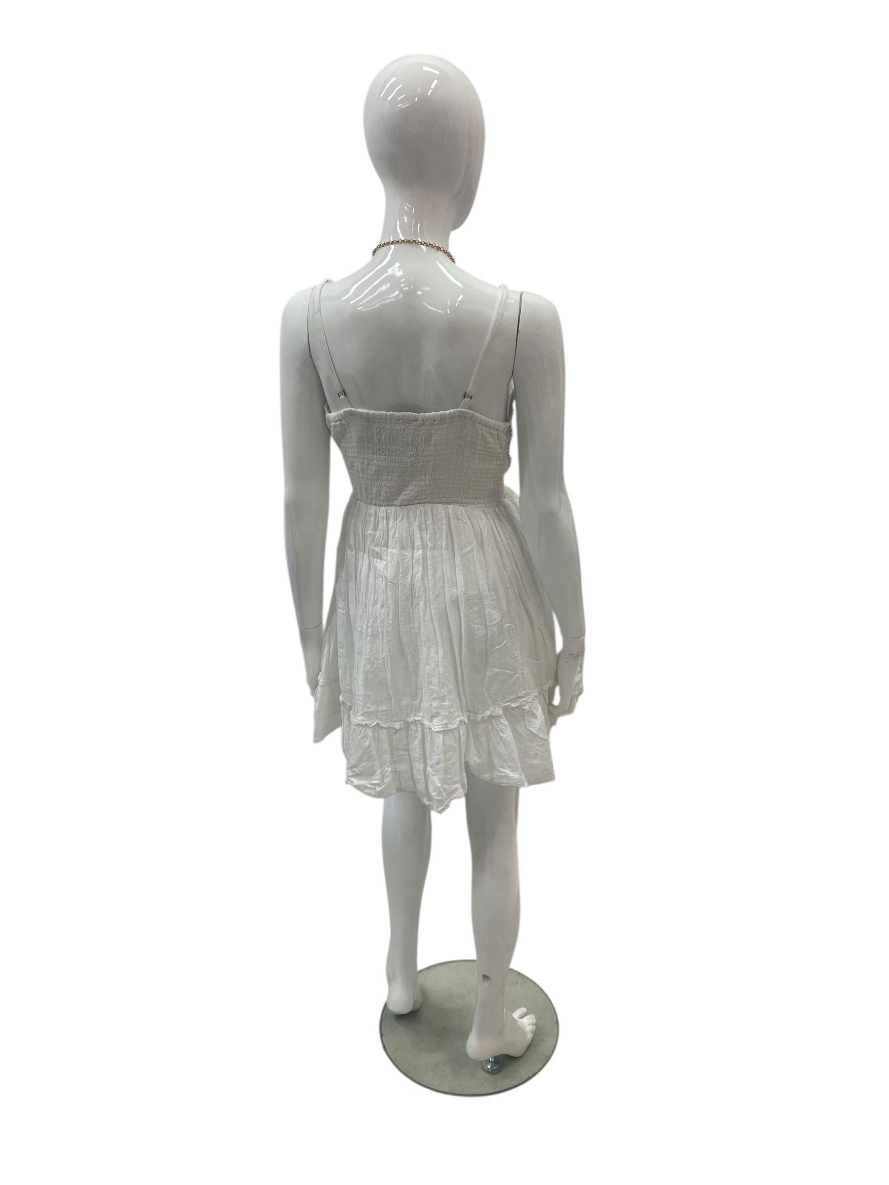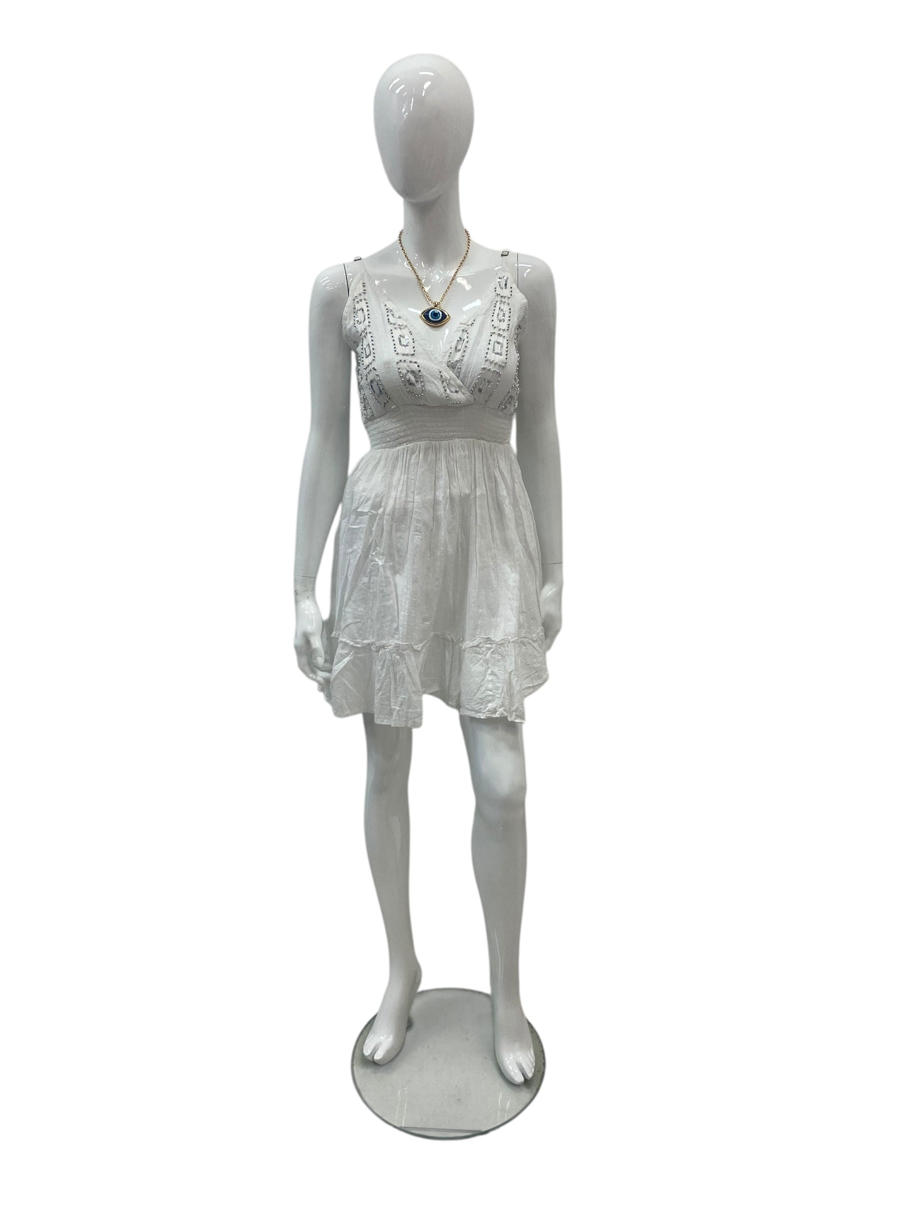 Breezy, feminine, and effortlessly elevated, this white embroidered mini dress captures the essence of relaxed coastal luxury. Crafted in a soft, lightweight fabric, it drapes beautifully while keeping the silhouette airy and easy. The deep V neckline is adorned with intricate embroidery that adds subtle sophistication, while the billowed sleeves and tiered skirt give it a soft, romantic movement. The adjustable waist tie allows you to cinch and define your shape, offering comfort without sacrificing polish. It’s a dreamy blend of simplicity and refined vacation style.