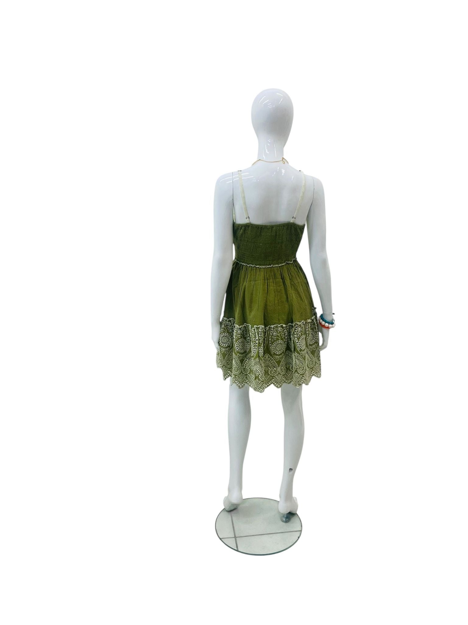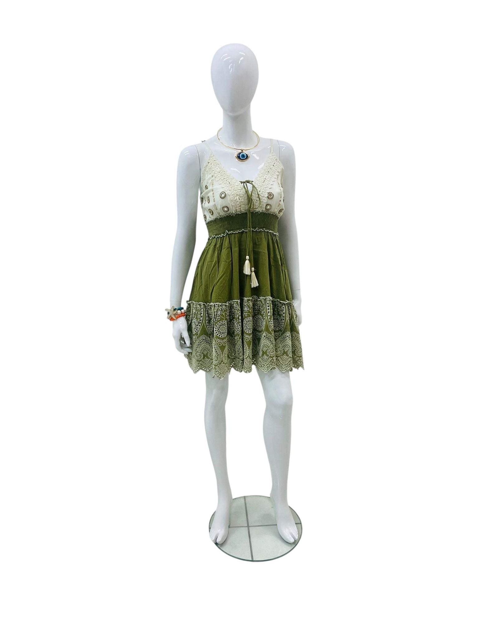 This dress carries a soft, earthy elegance — a blend of fresh meadow green and creamy lace that feels both delicate and grounded. The top has a vintage-romantic charm, with embroidered detail and gentle texture, like something discovered in a sun-washed boutique in a quiet European village. The cinched waist and tassel ties add that effortless boho femininity, while the tiered lace hem gives it movement and a whisper of whimsy.