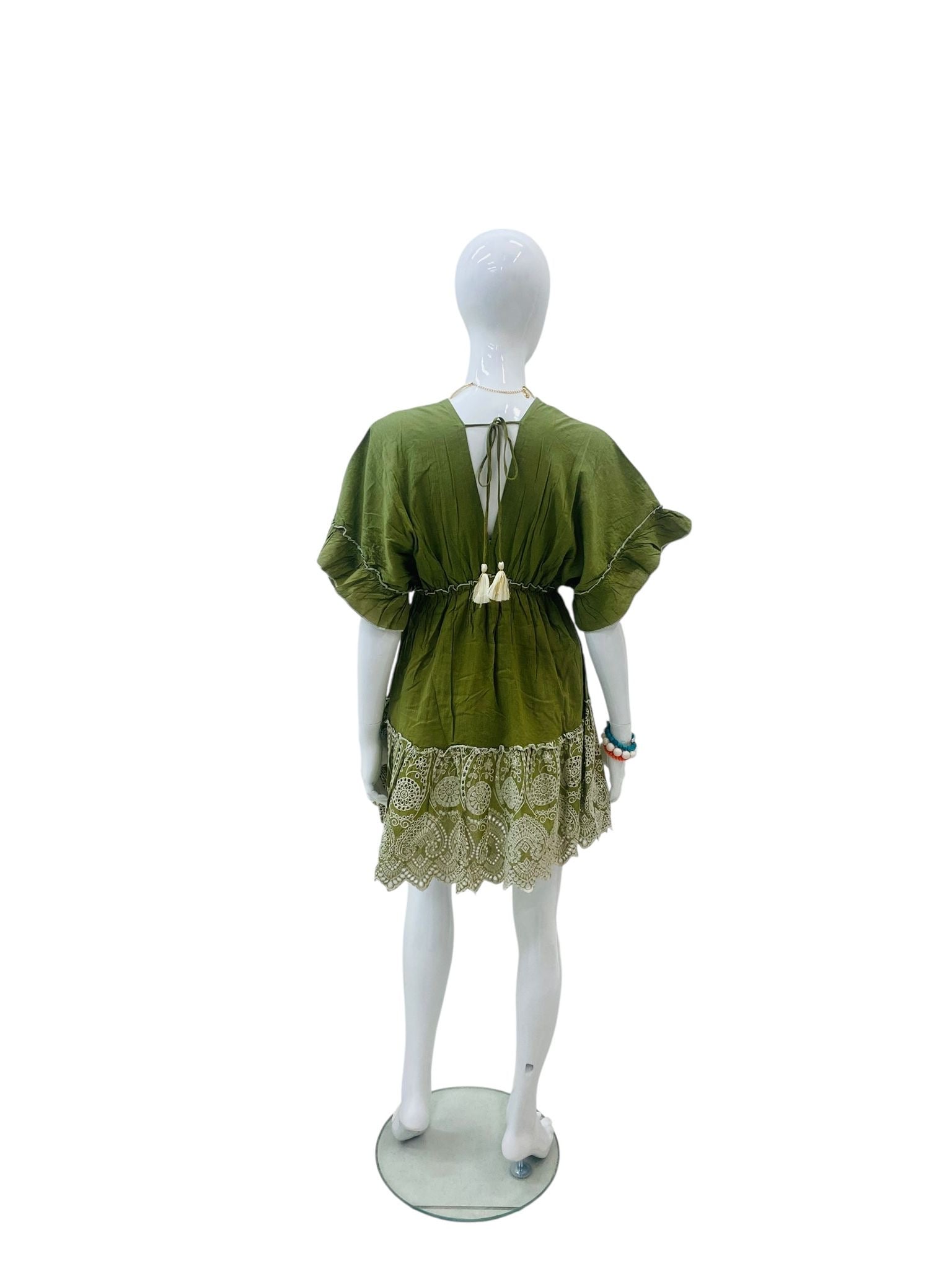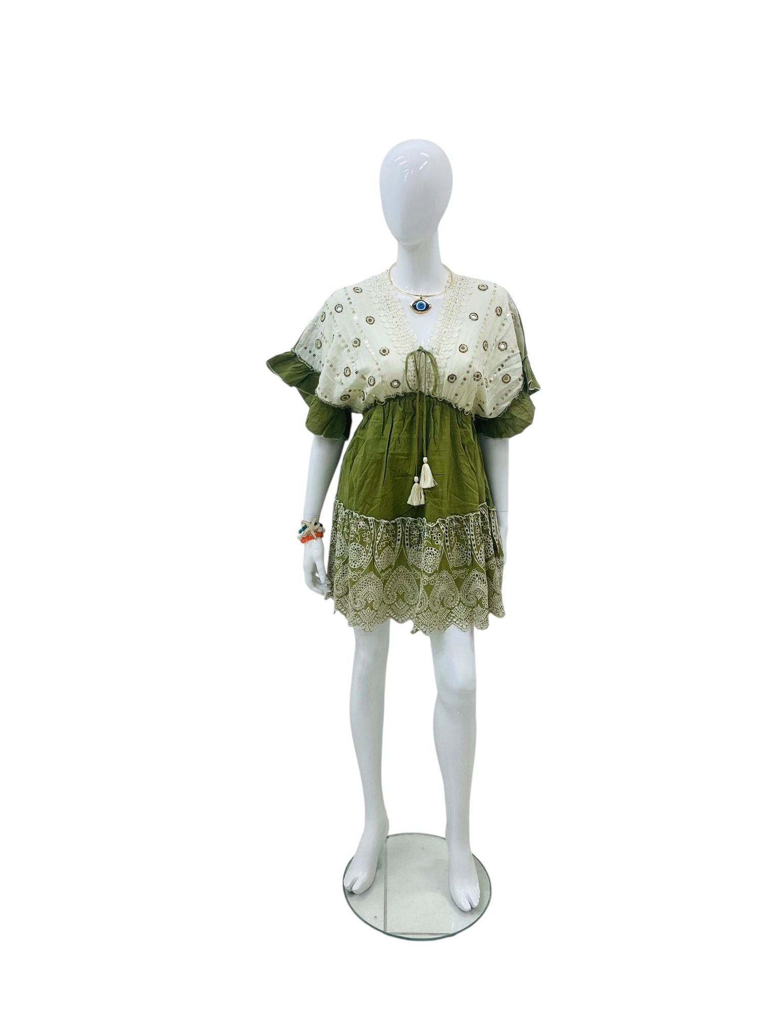 This look blends earthy romance with a refined boho sensibility. The soft ivory eyelet paired with rich olive green creates a grounded, nature-inspired palette that feels organic and elevated. The silhouette is airy and relaxed, cinched gently at the waist for a flattering, floaty shape that moves beautifully.