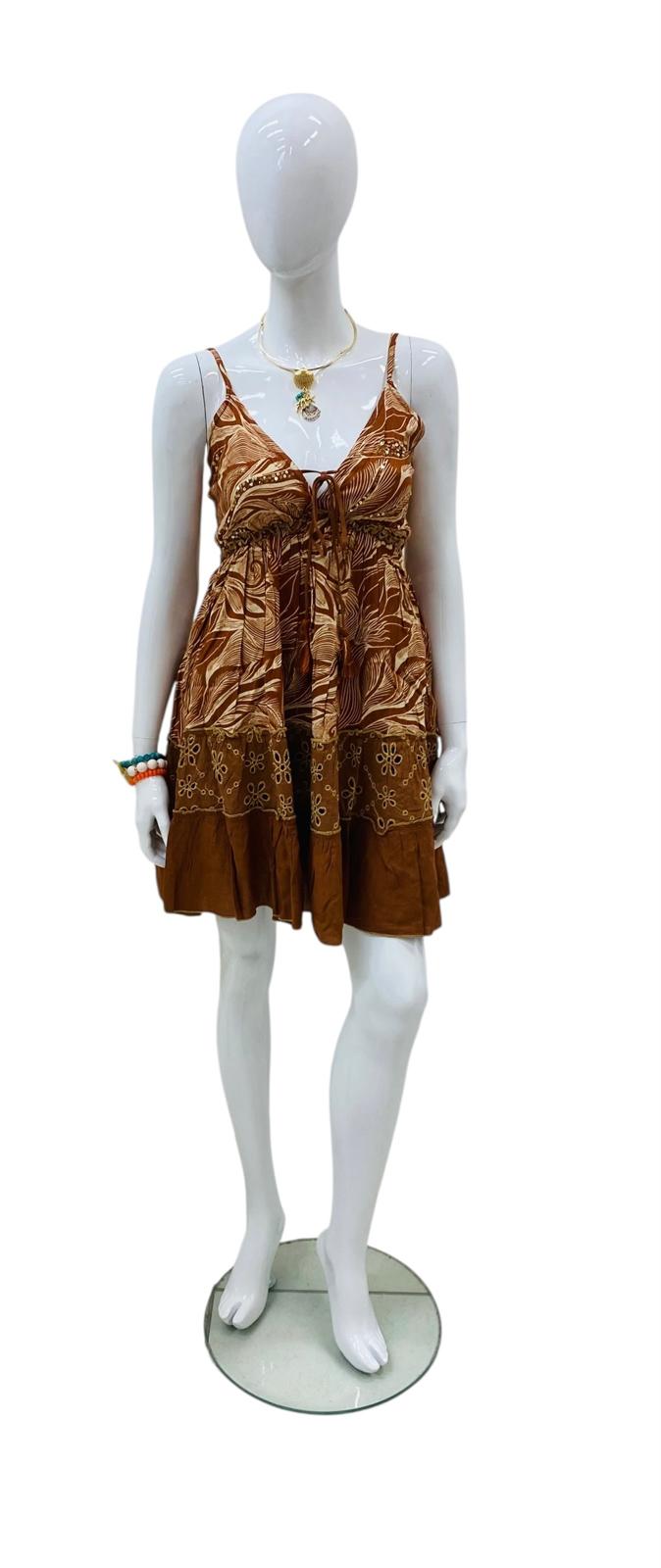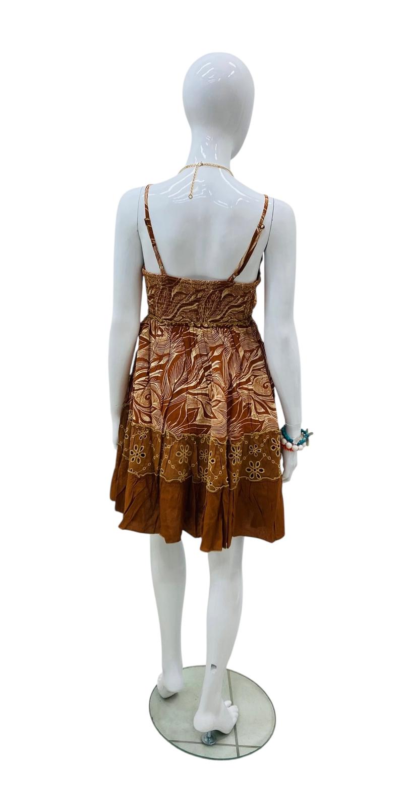 This dress brings a warm, earthy romance — like sun-kissed afternoons, terracotta rooftops, and the soft glow of golden hour. The rich brown tones feel grounded and natural, with a subtle bohemian soul. The delicate straps and fitted bodice create an airy, feminine silhouette, while the tiered flow of the skirt adds a playful, movement-filled charm.