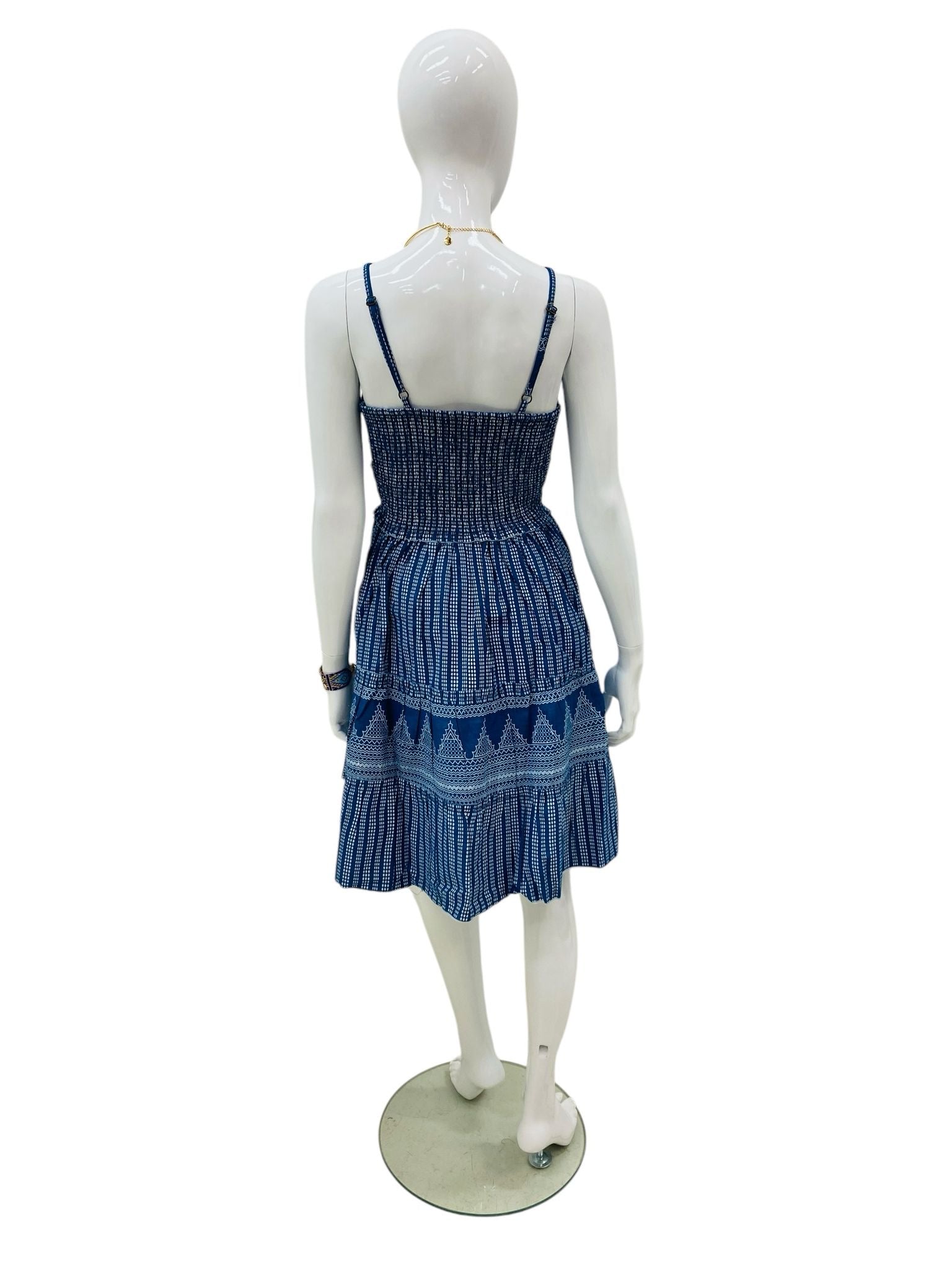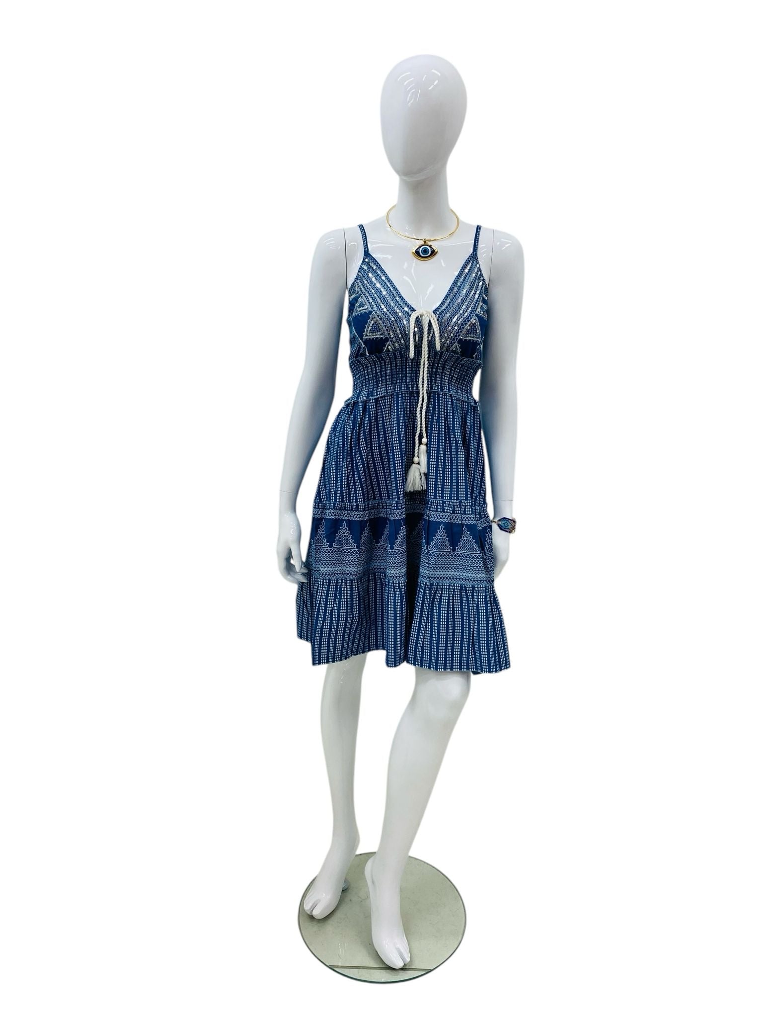 This dress has an easygoing charm, blending a relaxed silhouette with thoughtful details. The deep-blue tone, embroidered accents, and subtle gathered texture create a boho-inspired look that feels both carefree and refined. The adjustable tassel tie and fitted waist bring shape, while the flowing skirt keeps it light and comfortable.