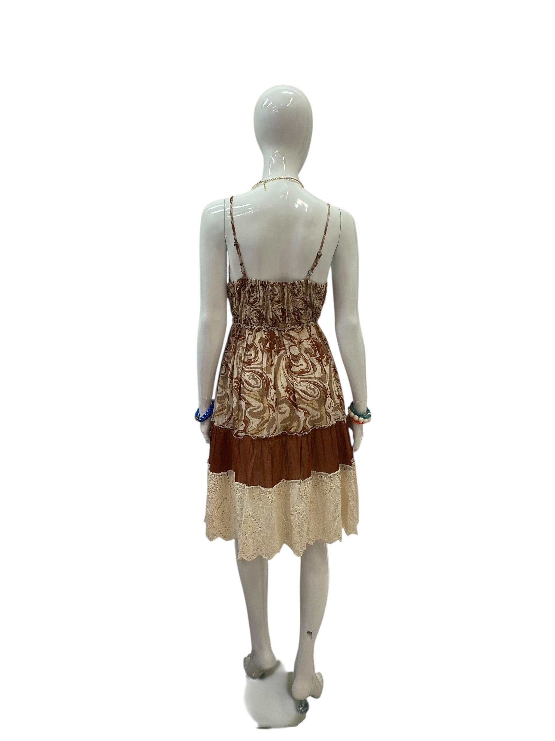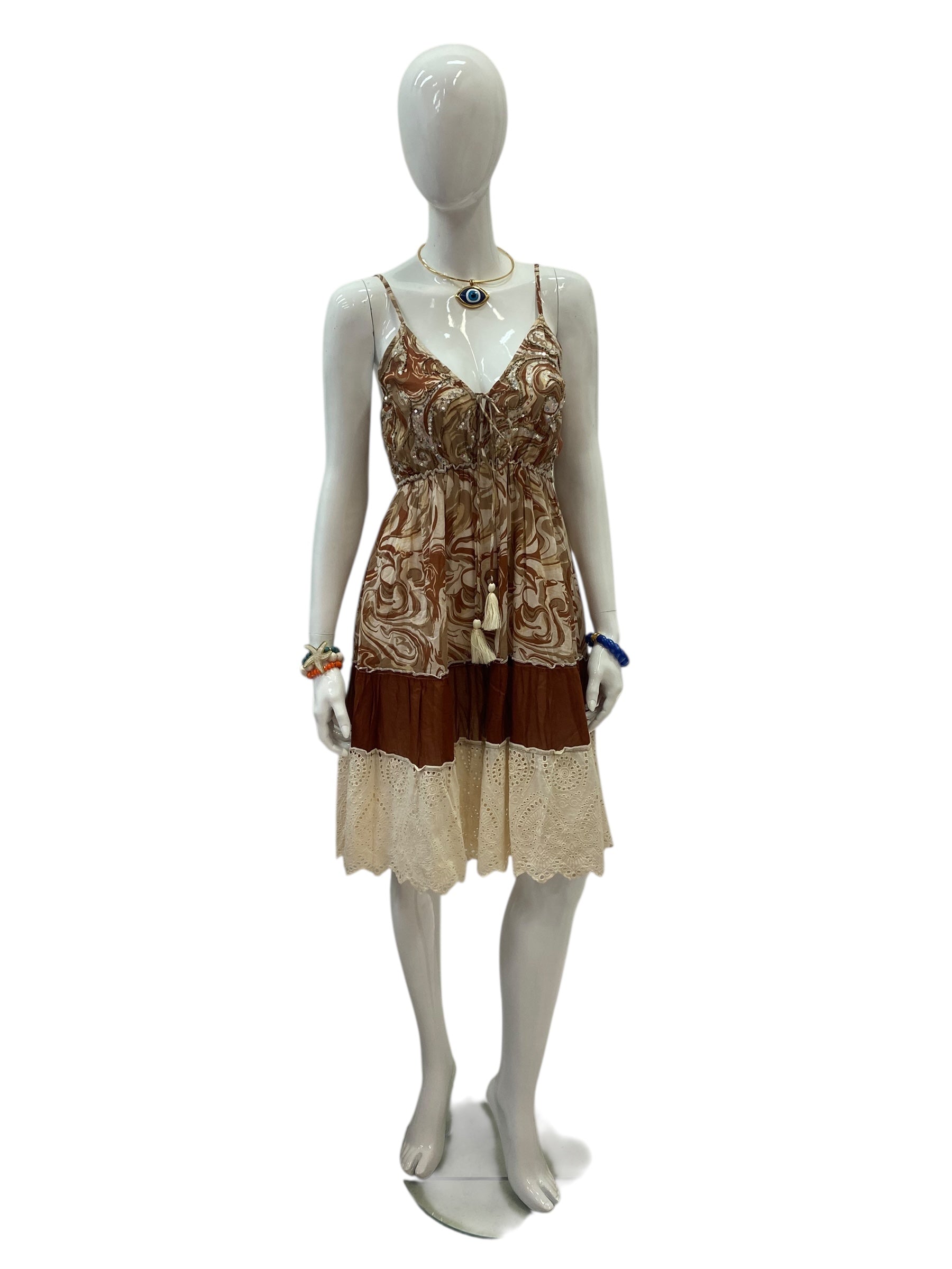 A softly romantic bohemian dress in warm earthy neutrals, this piece feels handcrafted and soulful, like something curated from a boutique in a small European village or found at a seaside artisan market. The bodice features a swirling baroque-inspired print in chocolate and caramel tones, meeting a contrast tier of solid brown that grounds the look, then falling into a delicate lace hem that adds a whisper of vintage femininity. Thin straps and a gently gathered waist create an easy, flattering silhouette — relaxed yet shaped, carefree but not messy.