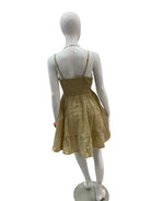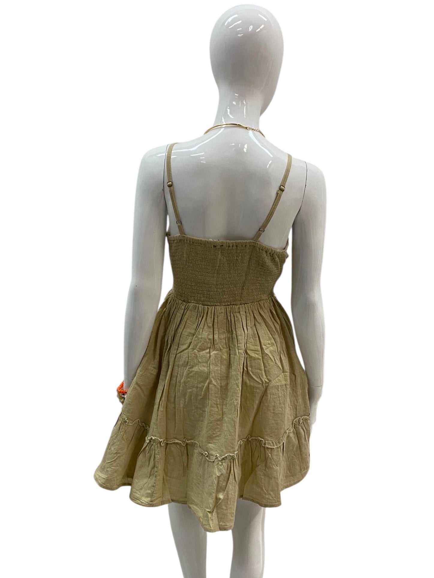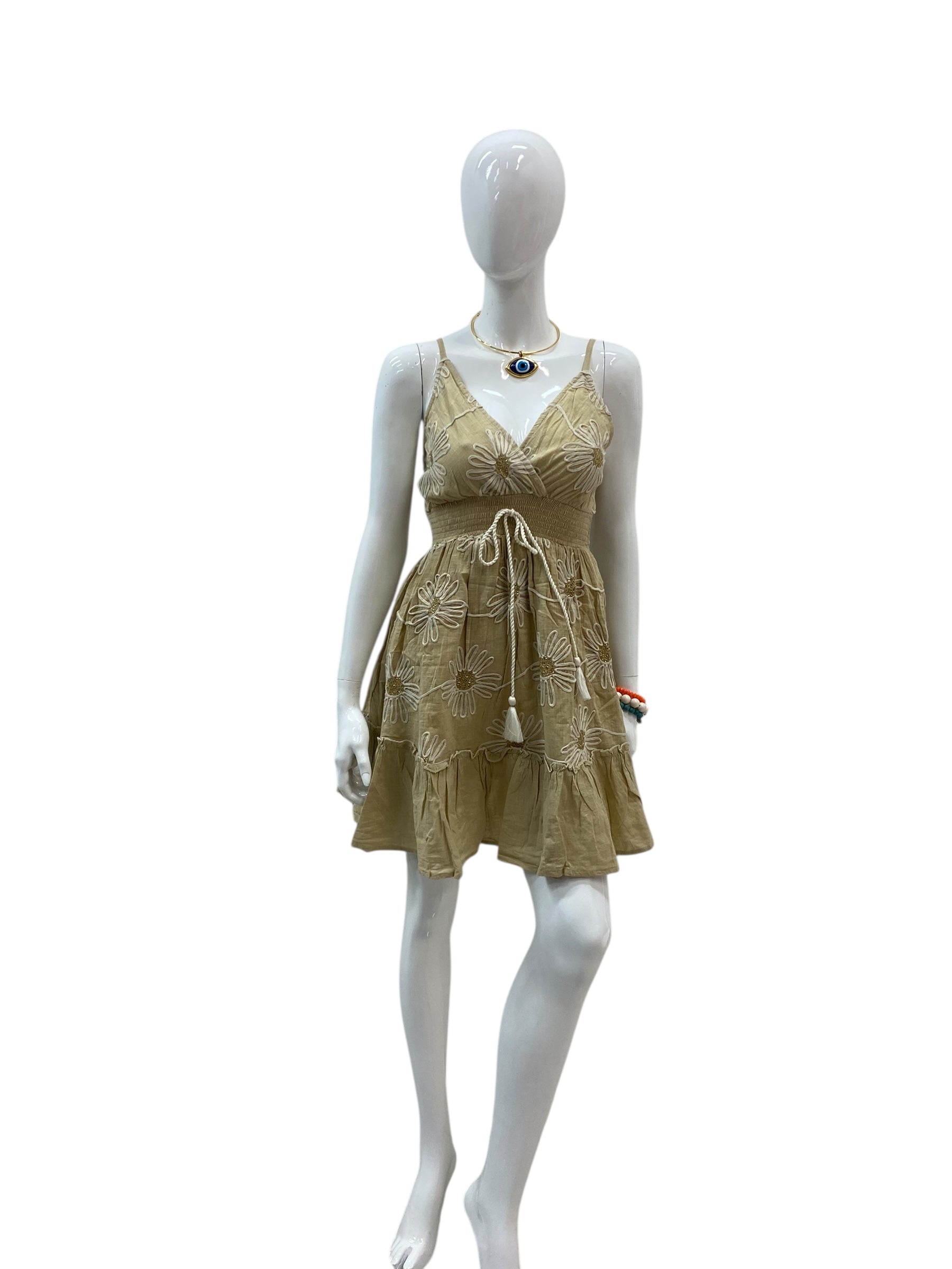 A feminine mini dress crafted in a warm beige tone with delicate embroidered detailing. Designed with a soft V-neckline, adjustable waist tie, and gently flared skirt, this silhouette flatters while remaining effortlessly comfortable. Lightweight and breathable, it’s perfect for sunny days, beach strolls, or casual summer outings. A timeless piece with a relaxed yet refined feel.