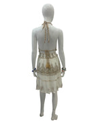 The braided halter tie with tassels is the heartbeat of the piece — part wanderer, part goddess. It adds a playful yet sacred air, suggesting someone who dances — not on a stage, but around bonfires, under string lights, in places where the night stretches and the world softens. The skirt flares lightly, easy and unfussy, ready for movement — strolling through warm streets, sitting cross-legged on woven rugs, leaning in close to share a secret or a laugh. This dress belongs to someone who keeps talismans in her pockets — coins from faraway places, pressed flowers, tiny handwritten dreams. Someone who loves velvet nights, jasmine tea, quiet glances, and stories that glow like embers.