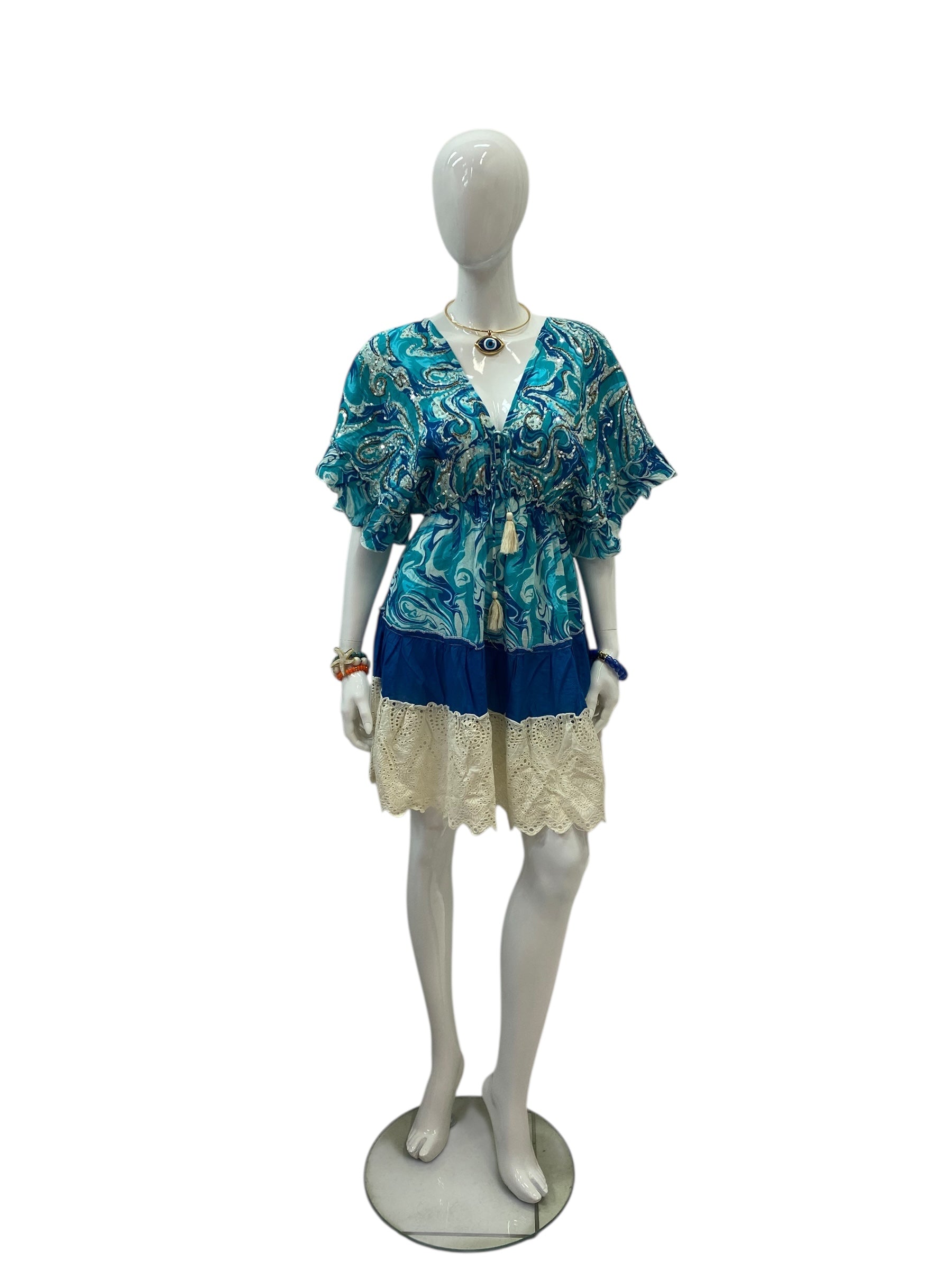 The relaxed, fluttery sleeves add a gentle airiness, like linen drying on a balcony overlooking the coast. The gathered waist creates shape while keeping the mood relaxed — a nod to carefree days, where comfort and beauty meet without trying. A bold cobalt tier grounds the ocean tones, before flowing into creamy lace that feels vintage, sun-bleached, and softly romantic — like lace trims on a cherished summer slip, worn on coastal escapes and barefoot strolls along weathered boardwalks. This dress belongs to someone who collects seashells and conversations, someone who reads on sun-warm rocks and lets her bracelets clink like tiny wind chimes. It pairs with woven straw, simple sandals, ocean-tousled hair, and a heart tuned to tides and sunsets.