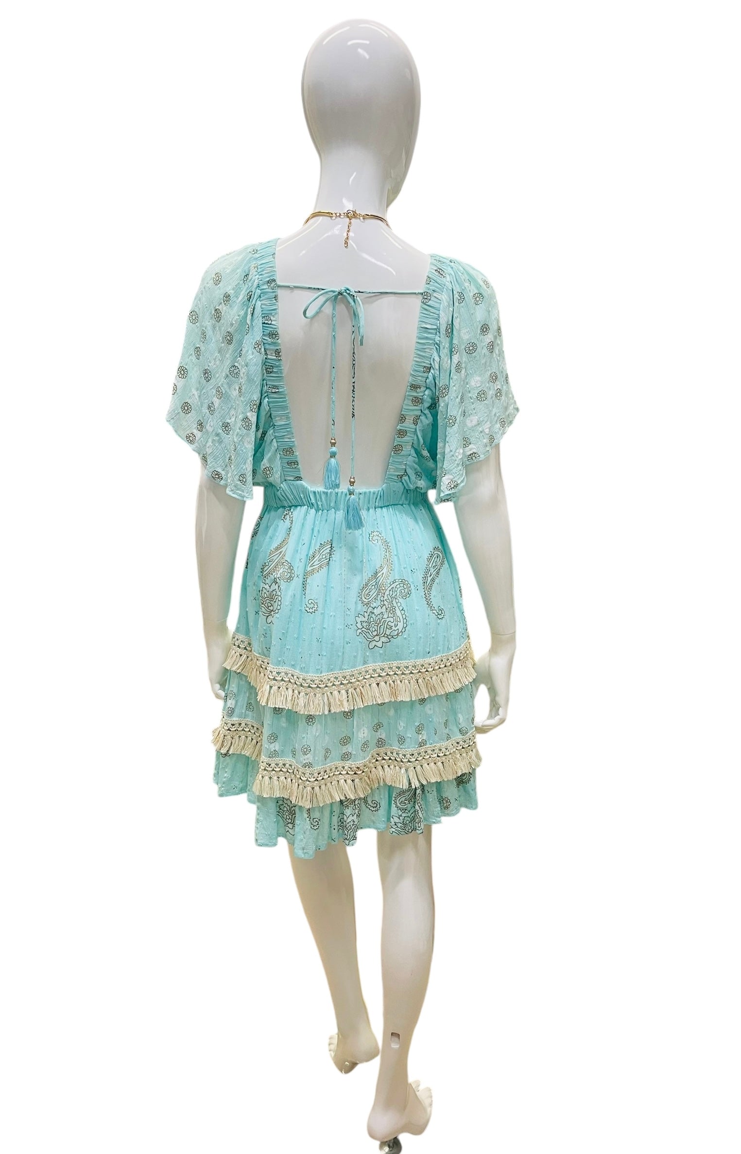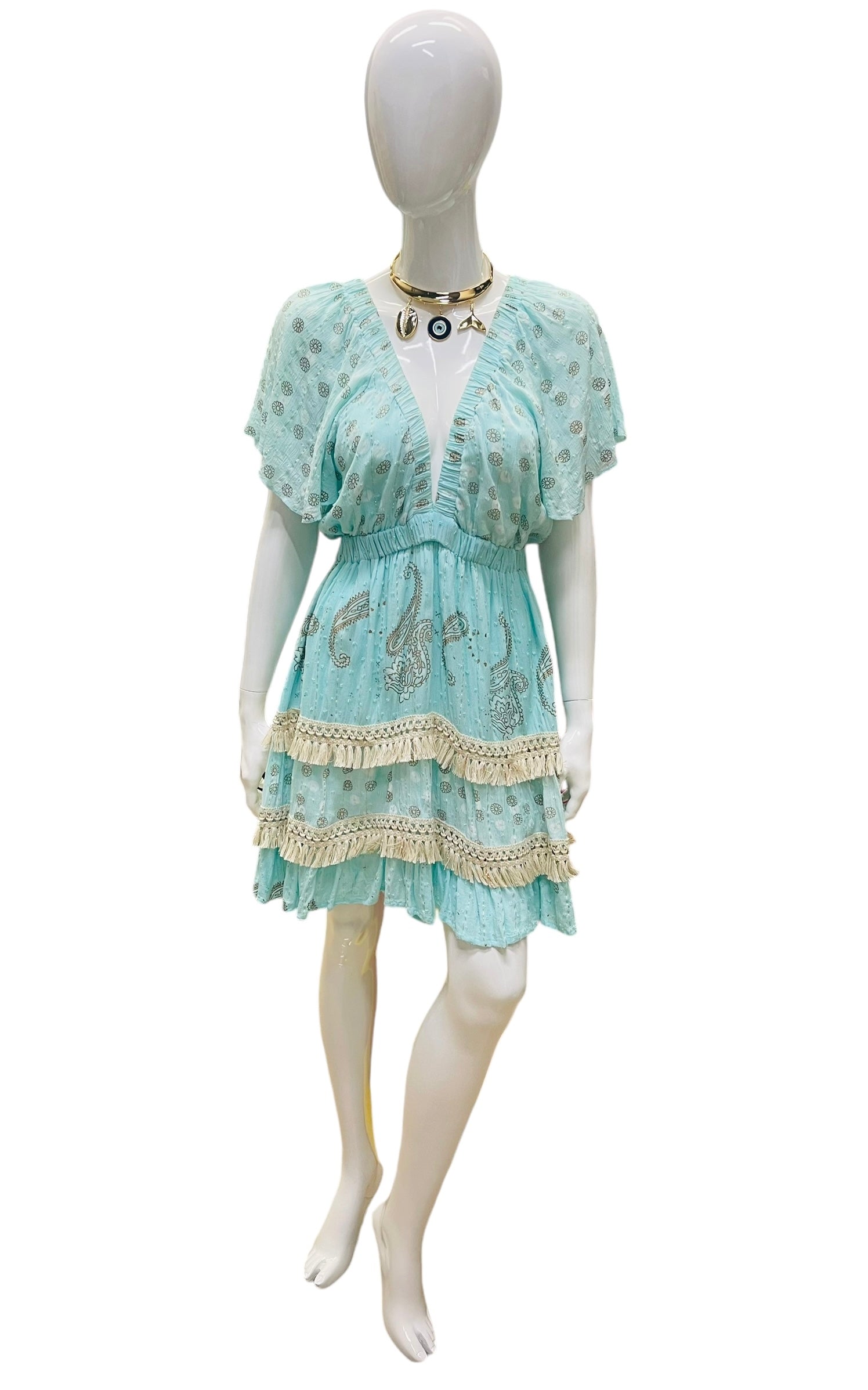This dress floats in with a soft, dreamy presence — a delicate boho piece in a serene seafoam shade that feels like sunshine and ocean air. The relaxed neckline and flutter sleeves create an effortless, romantic shape, while the gathered waist brings gentle definition without losing comfort.