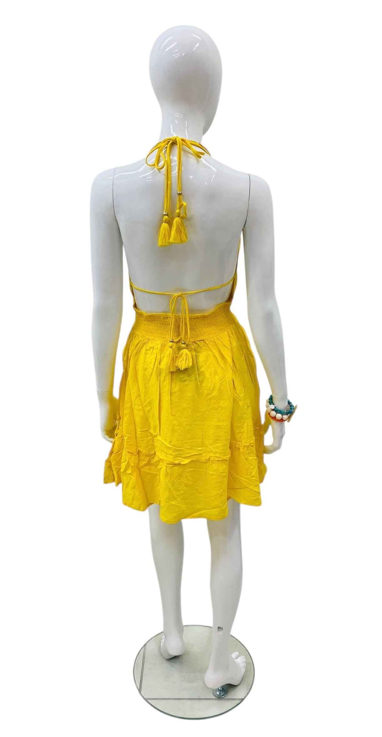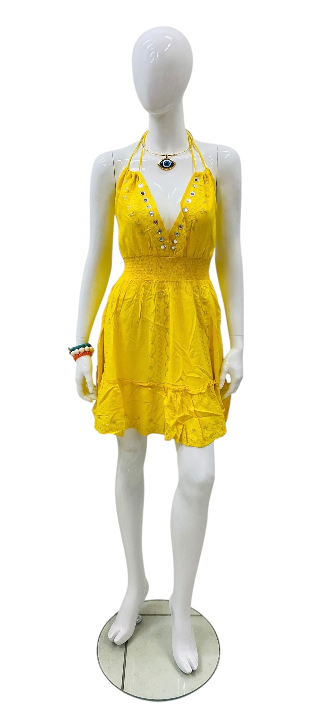Bask in bright, carefree confidence with this sunlit yellow halter dress — a radiant piece that brings instant warmth and charm to every setting. Crafted in a vibrant golden hue that naturally draws the eye, this flirty mini silhouette pairs playful movement with a feminine, body-flattering shape. The halter neckline highlights the shoulders and décolletage, while the gathered waist and lightly tiered skirt create soft, breezy volume for a look that feels both easy and irresistibly lively. Subtle embellishments add a touch of beach-glam sparkle, making this piece feel special without ever trying too hard.