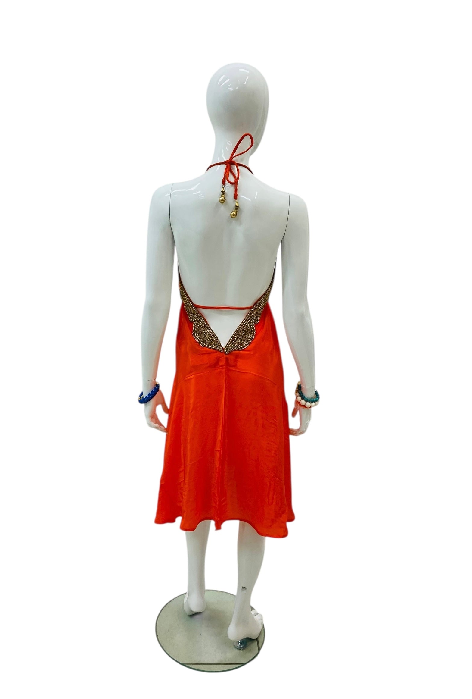 Bright, bold, and beautifully effortless — this short orange embellished dress is pure summer confidence. The vibrant citrus tone commands attention, while the hand-embroidered gold neckline and delicate beaded accents add that luxe, boho-chic finish. With a plunging V-neck, halter ties, and a breezy flowy silhouette, it flatters naturally and moves with you — playful, sexy, and sun-kissed.
